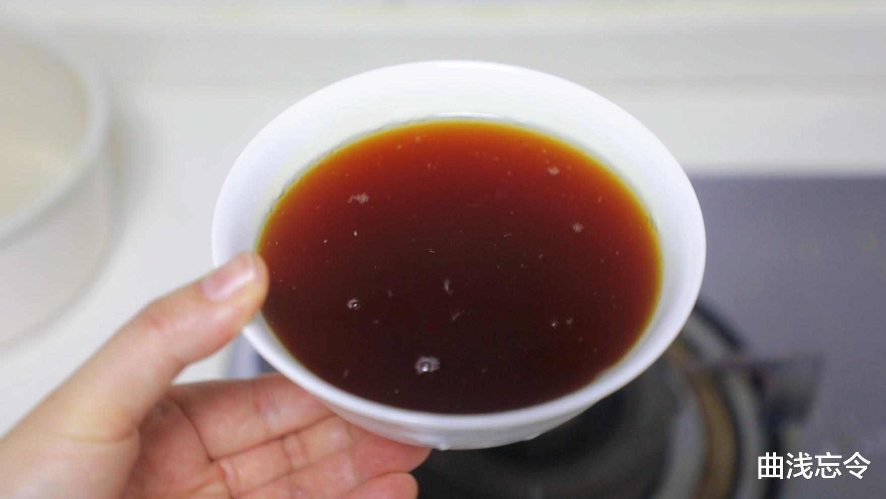 4、炒糖色:小锅中倒入少许食用油,油能打湿锅底即可,再倒入白砂糖晃动铺平,暂时不动,全程小火,至边沿开始变焦糖色,开始适当翻动混合,等白砂糖完全融化之后,开始不停搅拌,至糖液冒密集大气泡,色泽变深枣红色,关火,迅速倒入半碗清水,搅拌均匀,成品是透亮的深红偏黑的焦糖色。注意不要炒过头炒焦会发苦。