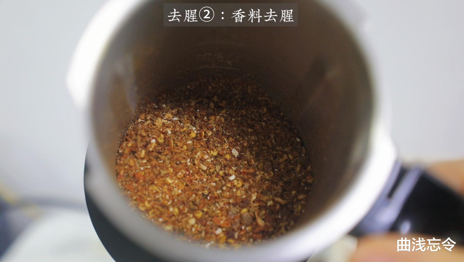 3、处理卤料包:把香料里的大颗粒拍碎,或直接把香料全部搅打成细颗粒状,装入小布袋,用温水浸泡10分钟,再次把卤料包用温水冲洗干净,捏干水分备用。