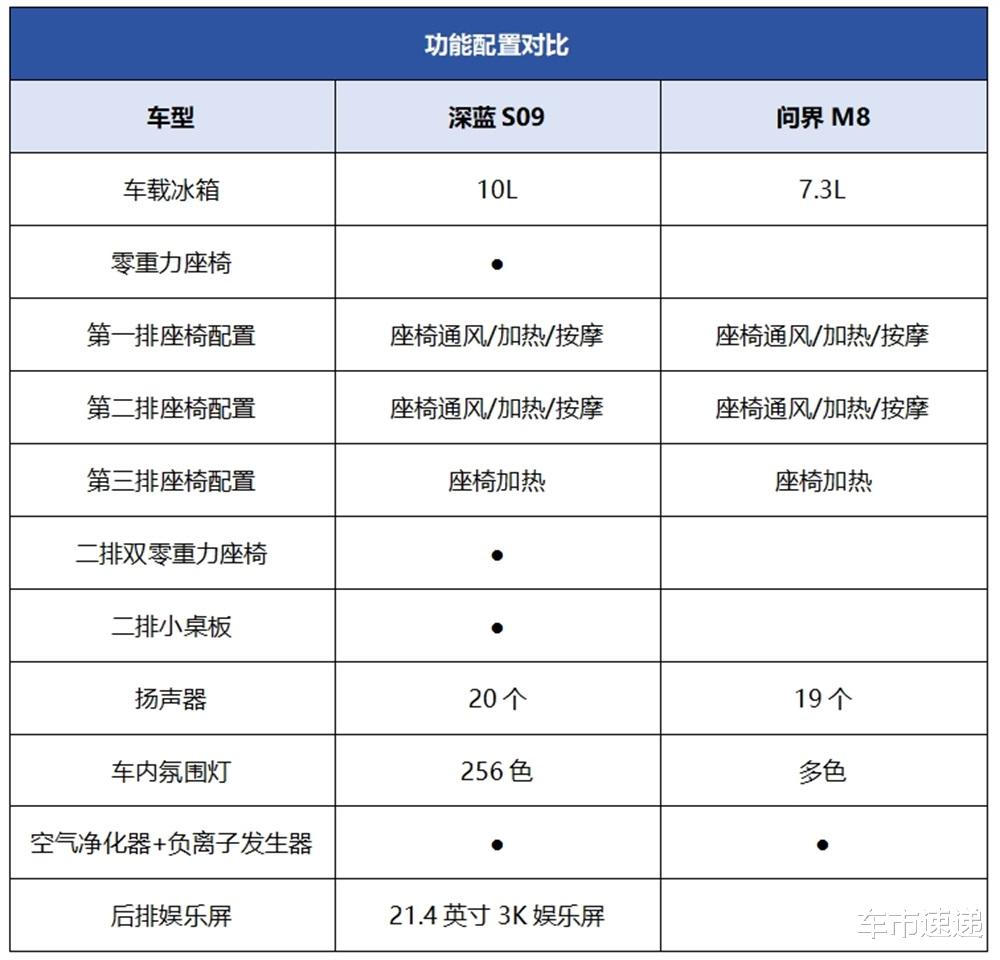 深蓝S09的冰箱为10L,问界M8的只有7L,冰箱空间上深蓝S09更胜一筹。
