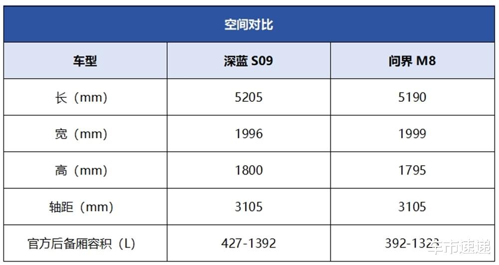 通过对比可以看到,虽然深蓝S09价格比问界M8的门槛要低很多,但尺寸上整体并不输给问界M8,均拥有宽体长轴的大空间,甚至深蓝S09在多个尺寸方面更具优势。
