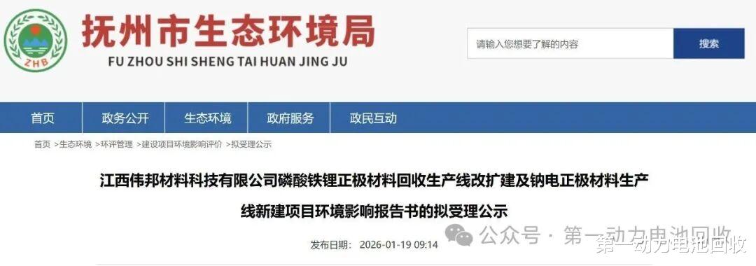 第一动力电池回收消息,近日,江西省抚州市生态环境局发布了《江西伟邦材料科技有限公司磷酸铁锂正极材料回收生产线改扩建及钠电正极材料生产线新建项目》环境影响报告书的拟受理公示。
