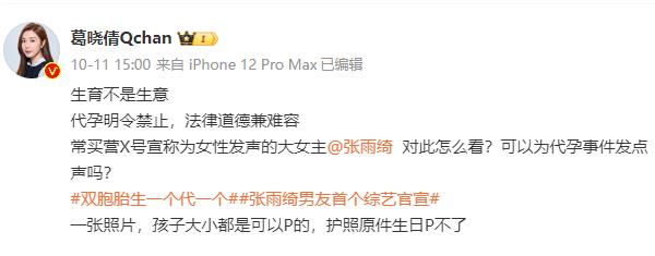 就在10月11号,葛晓倩在社交平台上对张雨绮发起了第一波“猛攻”,声称让张雨绮站出来直面代孕风波。