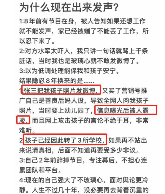 紧接着,葛晓倩表示自己想着能忍则忍,但结果“张三”却得寸进尺,将自己的孩子爆料在公共平台,导致孩子在学院遭受了霸凌。
