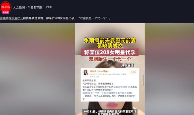 大众新闻·半岛都市报《张雨绮前夫袁巴元前妻葛晓倩发博,称某位208女明星代孕,“双胞胎生一个代一个”。》
