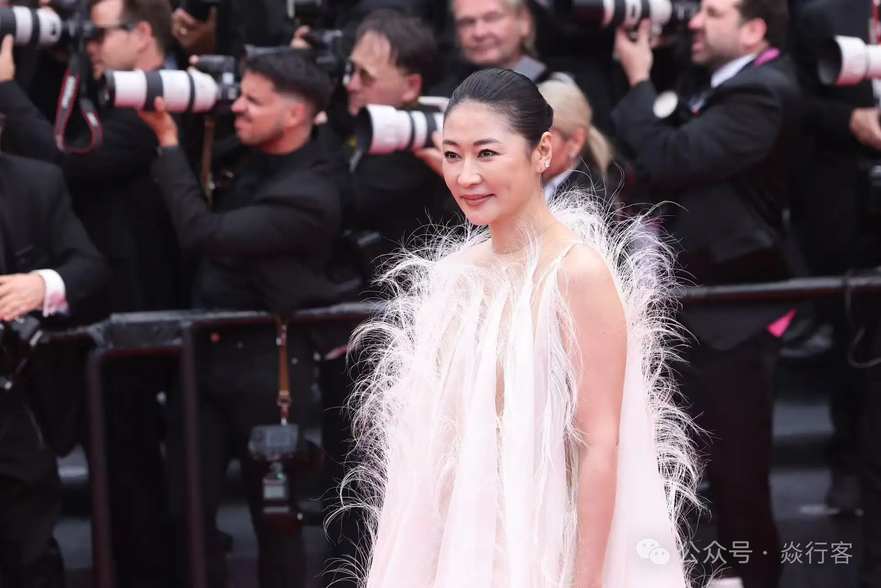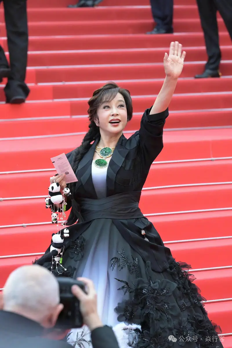 中国明星同样表现出色,刘晓庆身着黑白渐变裙,手持熊猫玩偶,尽显中国风,造型彰显东方文化魅力与成熟自信。