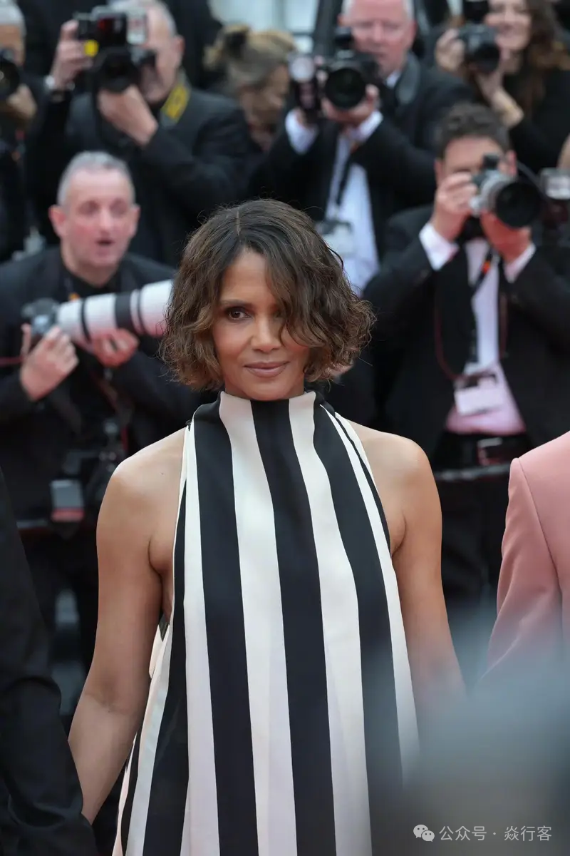 哈莉·贝瑞、黑白条纹裙简约流畅。