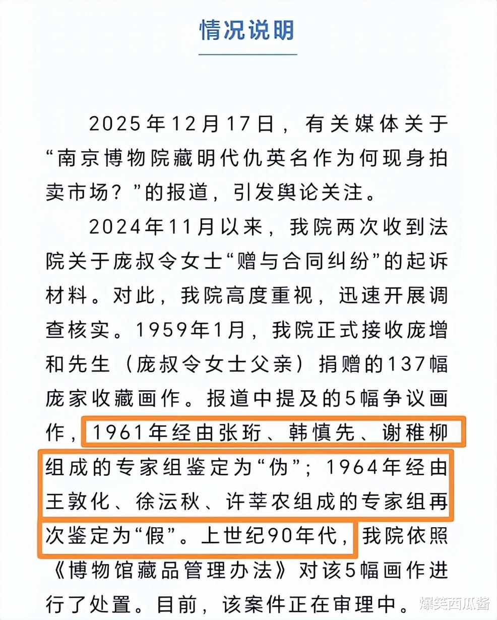 法律专家现在争论的焦点在于,即便认定是伪作,处置前是否应当先通知捐赠人?这在法律上或许还有扯皮的空间,但在伦理上答案是绝对的。人家把传家宝托付给你,你不想要了,第一反应难道不是还给人家吗?悄悄卖掉算怎么回事?庞家手里那张发黄脆裂的60年前的捐赠清单,此刻与其说是荣誉,不如说是南博背信弃义的罪证。