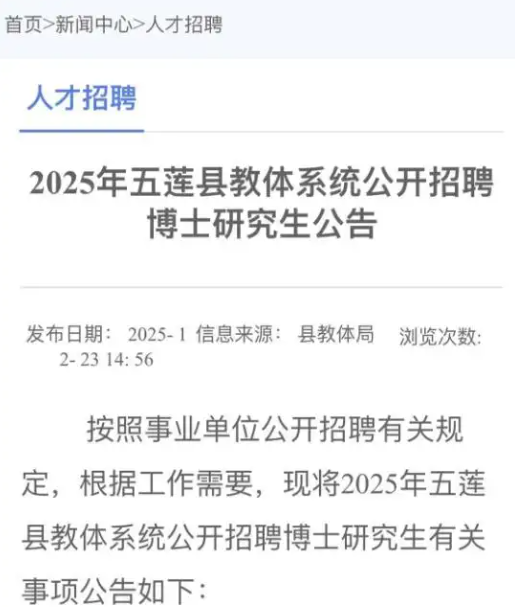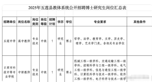 就算博士学历,随便过个教资,去市里的学校搞个编制不难吧,为啥非要去五莲?除非这个博士就是五莲人,想回五莲,学校设个坎,别人别竞争了。但是都博士了,显然不用这么搞。所以就是正常招老师。