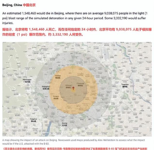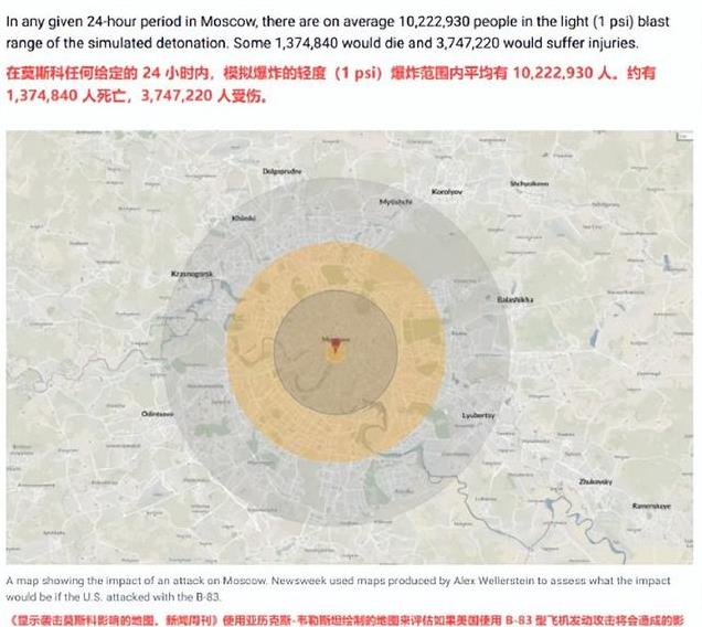 如果遇袭的城市换成莫斯科,则会130万人死亡、300万人受伤;平壤的“伤亡数据”则是130万人死亡、110万人受伤。