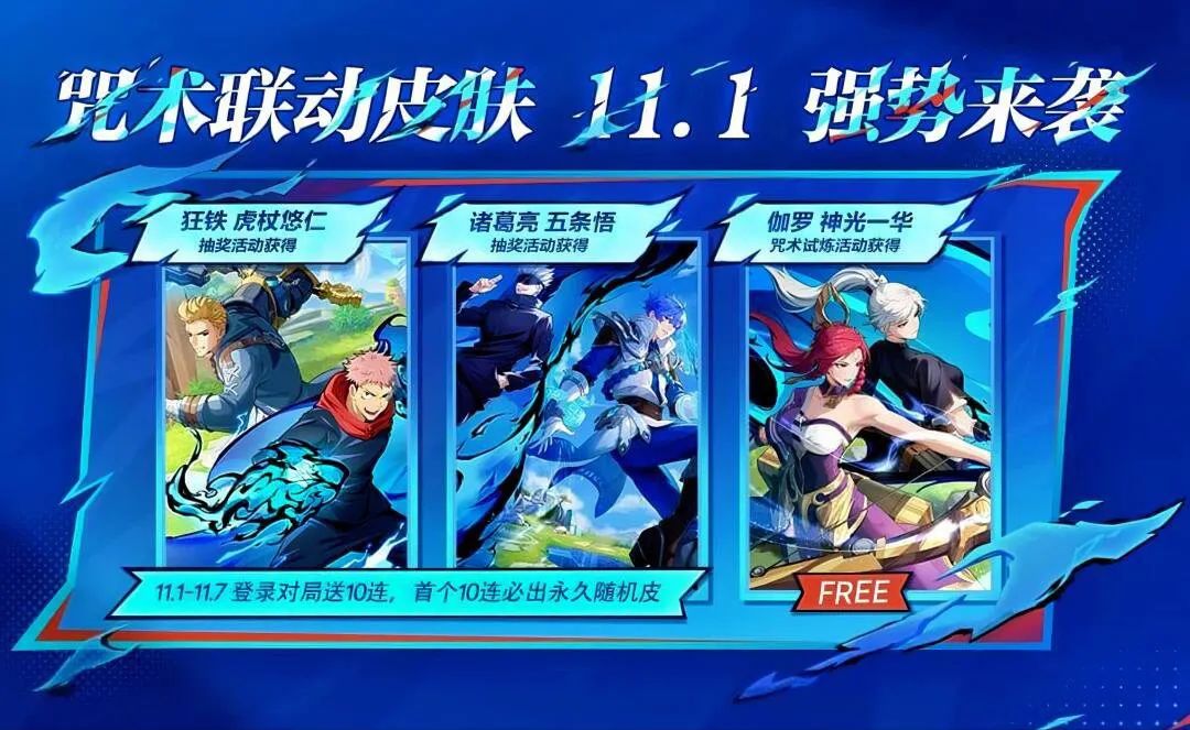 还记得去年王者荣耀国际服与咒术回战的联动吗?一共推出了三款皮肤,其中两款是主角皮肤,一款是路人皮肤。主角皮肤是虎杖悠仁和五条悟,分别给到了狂铁和诸葛亮。而路人皮肤是给到了伽罗。