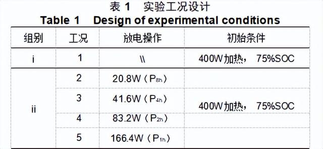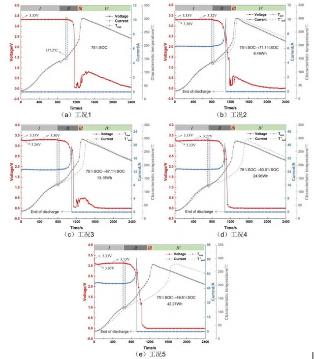 在组别i中,作为对照组,不进行放电操作,仅针对75%SOC的样品电池开展400W的热滥用实验。在组别ii中,考虑真实应用场景的功率放电模式并结合储能放电时长,设置20.8W、41.6W、83.2W、166.4W四种恒定放电功率,分别对应8h、4h、2h、1h四种放电时率,初始条件和组别i保持一致。