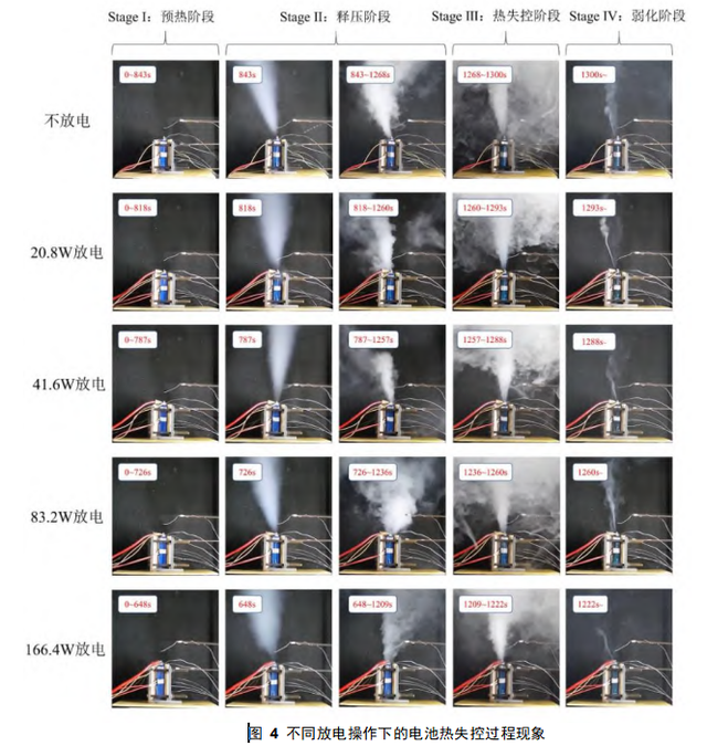 电池热失控过程与先前研究结果高度一致,故参照其方式将热失控过程划分为如下四个阶段:(Ⅰ)预热阶段;(Ⅱ)释压阶段;(Ⅲ)热失控阶段;(Ⅳ)弱化阶段。图4展示了在不同放电操作下,被试电池在上述四阶段的特征现象。