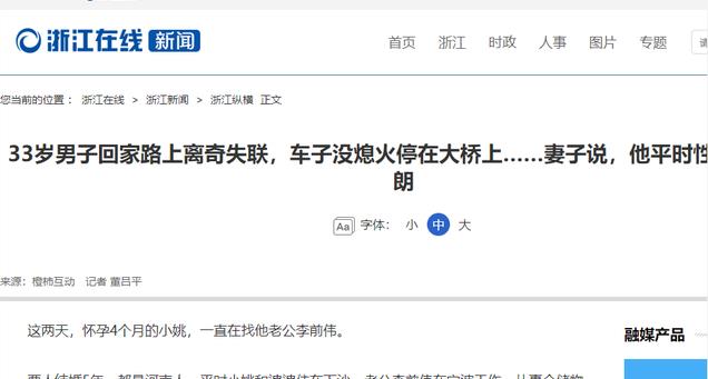 信息来源:浙江在线2022年12月9日33岁男子回家路上离奇失联,车子没熄火停在大桥上……妻子说,他平时性格也很开朗