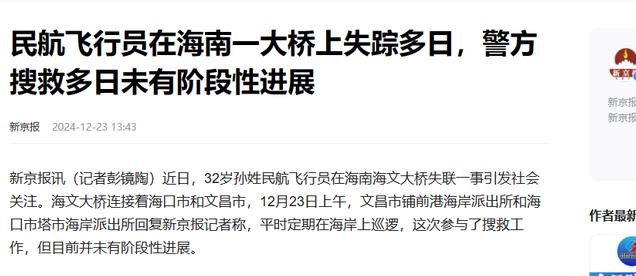 信息来源:新京报2024-12-23民航飞行员在海南一大桥上失踪多日,警方搜救多日未有阶段性进展