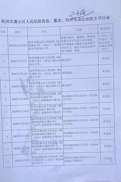 一、从 2015 年至今,萧山区法院裁判、执行法官共伪造、篡改、扣押多达 20余份法院文书,且伪造、篡改的法律文书均未依法定程序送达当事人,甚至委托翔盛集团代替法院出示法院文书,其手段和性质极为恶劣。
