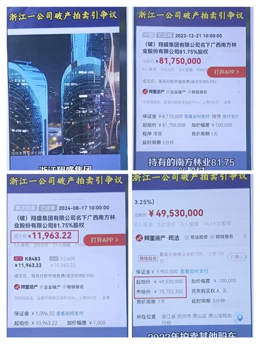 六、从 2018年起,破产管理人接管控股大股东翔盛集团在“南方林业”财产权管理权7年,却拒不履行管理人职责,放任翔盛集团及其派出的法人代表继续非法处置被多家法院査封冻结的“南方林业”的林木资产,侵占“南方林业”5.3亿元资金未被清算更未被刑事追责。这次拍卖,翔盛集团在“南方林业”有争议的全部股权时,又拒不向“南方林业”股东履行告知义务,滥用职权违法将翔盛集团在广西“南方林业”有争议的股权认定为 8175 万元。公开推翻萧山区法院对“南方林业”股权价值的裁定,并将法院裁定的翔盛集团在“南方林业”的436528650元股权在拍卖网页中故意设置为零市场价零底价,以此误导欺骗公众。