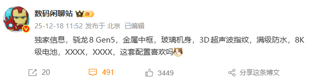 近日, 知名博主@数码闲聊站 发文透露:“独家信息,骁龙8Gen5,金属中框,玻璃机身,3D超声波指纹,满级防水,8K级