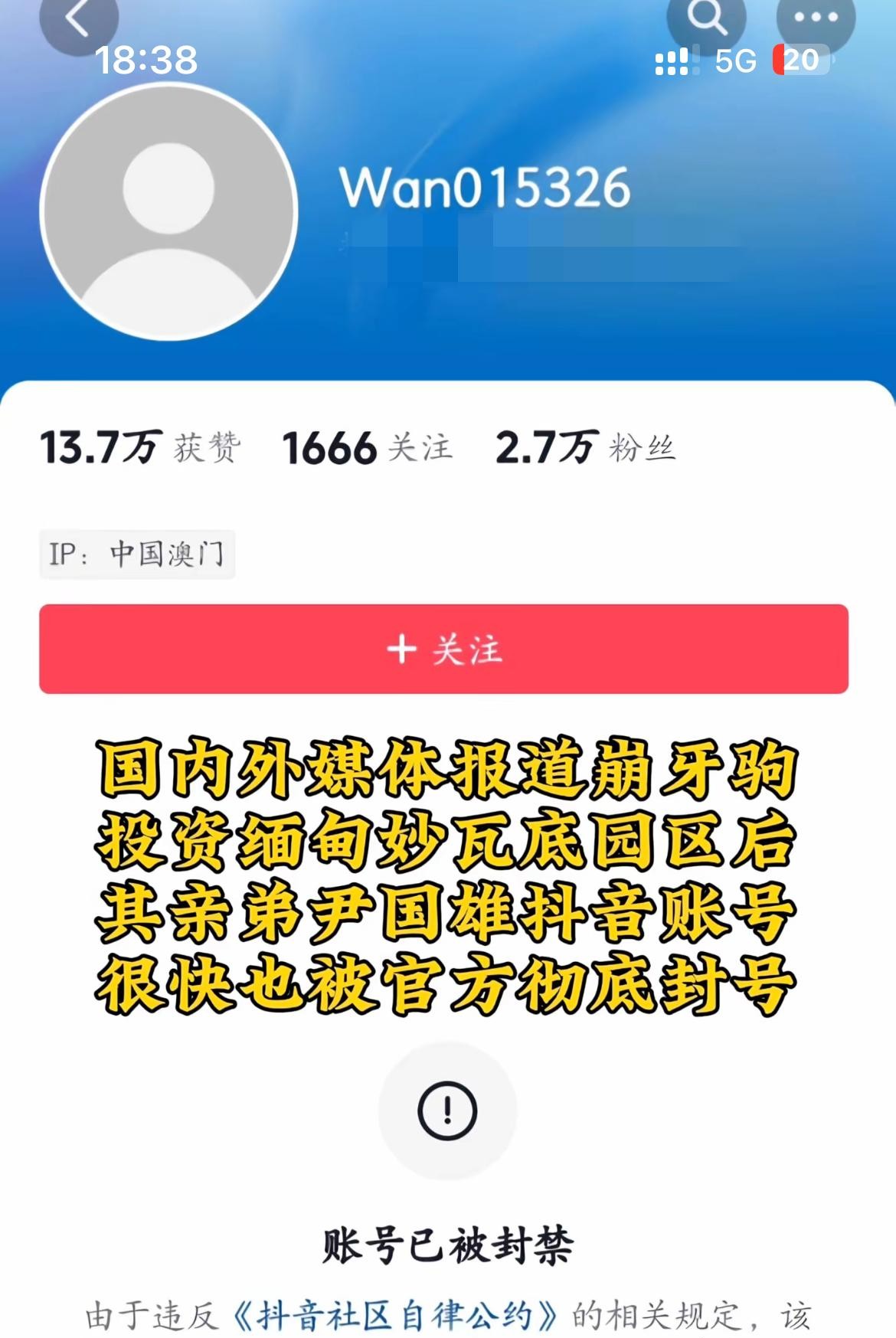 崩牙驹的女儿尹倩仪,平时搞搞设计,养养豹猫,正正经经的,没啥大毛病,账号说封就封,这有点不合常理吧?是不是因为她老爹的缘故?这还真有可能!毕竟,崩牙驹的弟弟尹国雄,账号被封是有原因的,他之前好像还干过一些不太光彩的事儿,比如骂人、涉嫌诈骗什么的。 这兄弟俩,一个好好的,一个有污点,账号却都一起凉凉了,不得不让人多想啊!