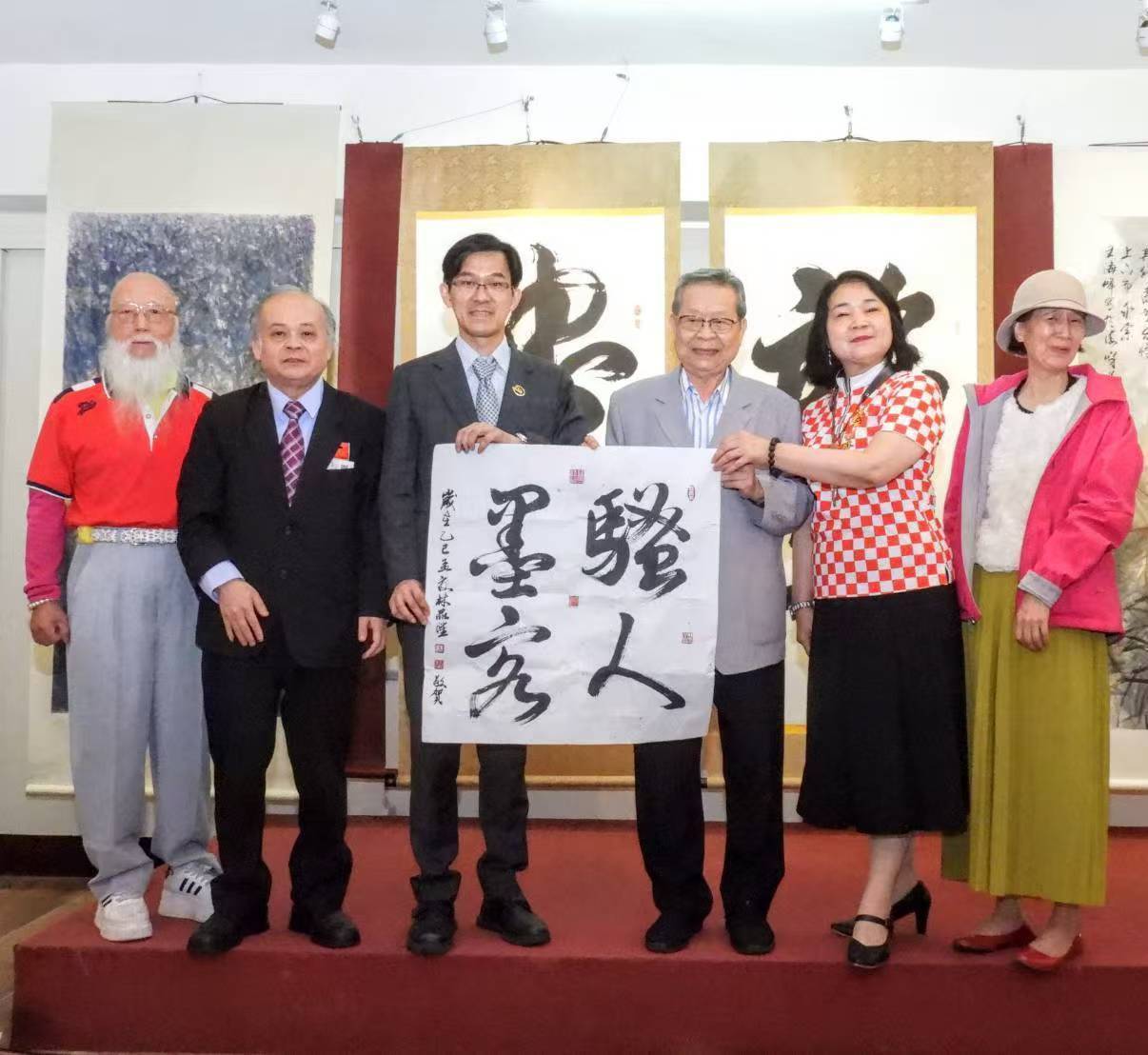 致以贺词的各界人士包括:彰化市长林世贤、台湾全球中华文化艺术薪传奖历届当选人联谊会会长丁锦泉、台湾中国美术协会理事长李沃源、中华画学会理事长沈祯、台湾中国书法学会理事长陈铭镜、台湾文联台湾书法家协会会长沈荣槐、中华美术家协会会长王海峰、孔子76代孙孔令俊、杨静江、吕仁清、冯士彭、余振明、江鸿政、詹德源、林品陞、罗慧等。
