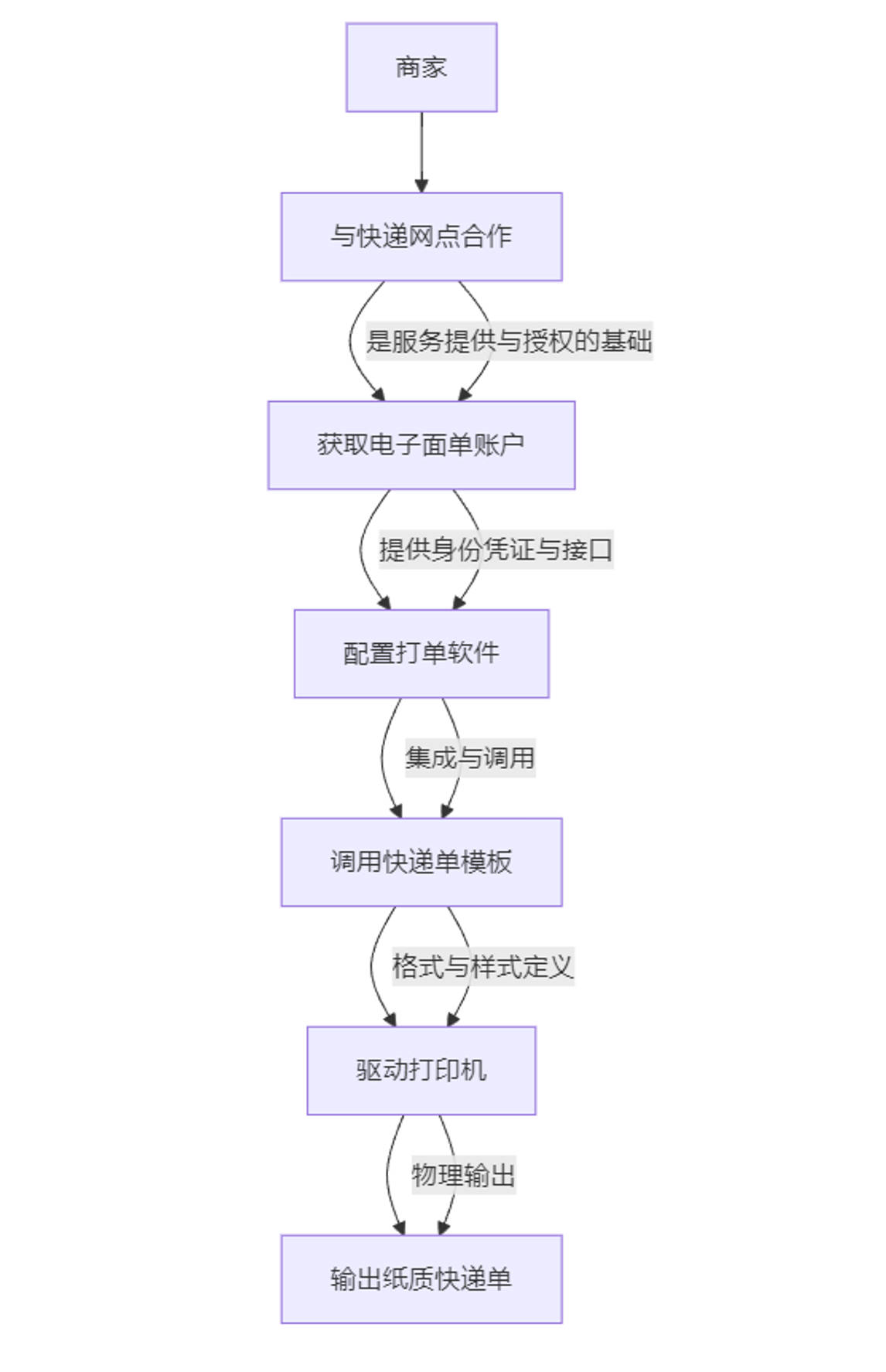 理解了个体之后,我们再把它们串起来,看看一个完整的电商打单流程是如何实现的: