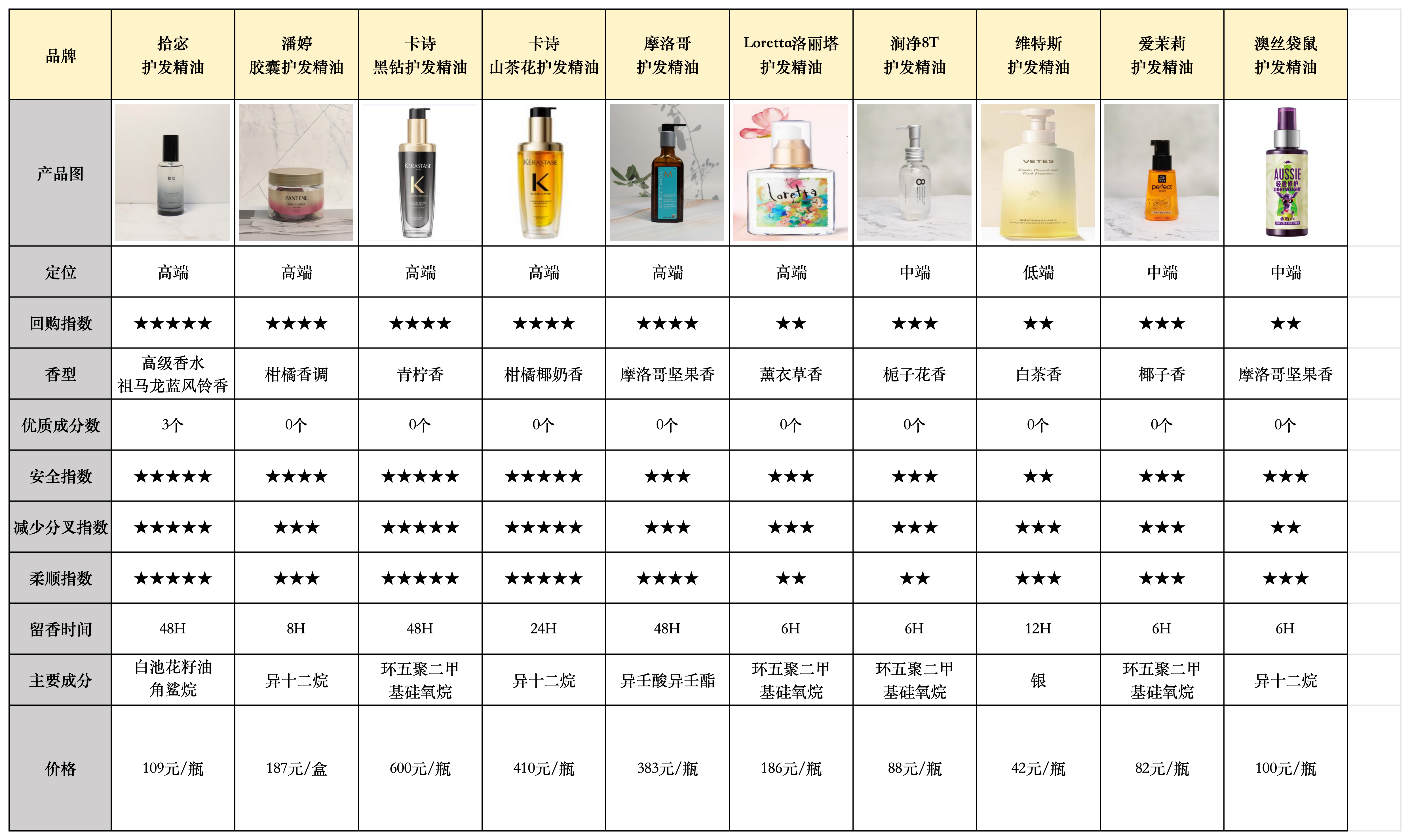 大家请先看看这几款护发精油的的基础概览,初步了解它们的区别: