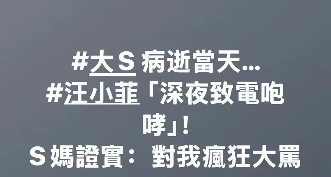 台媒曾报道大S去世后,汪小菲情绪失控,深夜打电话责骂S妈。