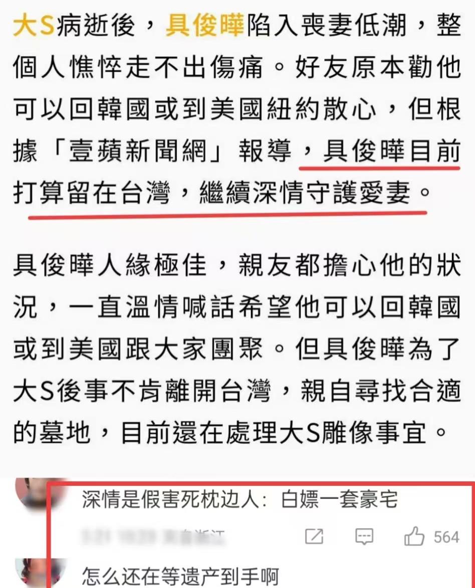 台媒称赞具俊晔深情,但网友们却并不买账,纷纷猜测他留下是为了遗产和豪宅。