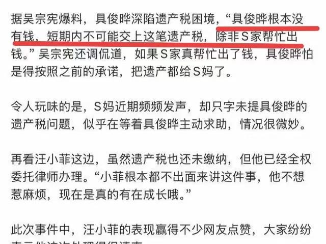吴宗宪也曾透露具俊晔的困境,除非S家帮忙,否则短期内难以支付遗产税。
