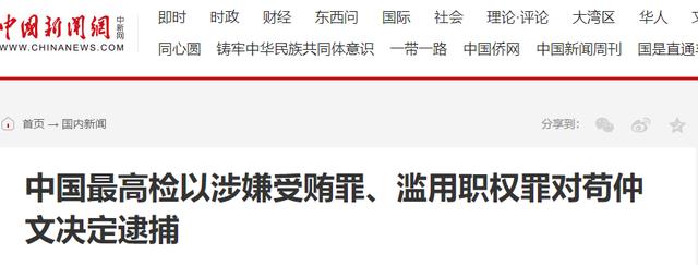 中国最高检以涉嫌受贿罪、滥用职权罪对苟仲文决定逮捕|中国新闻网