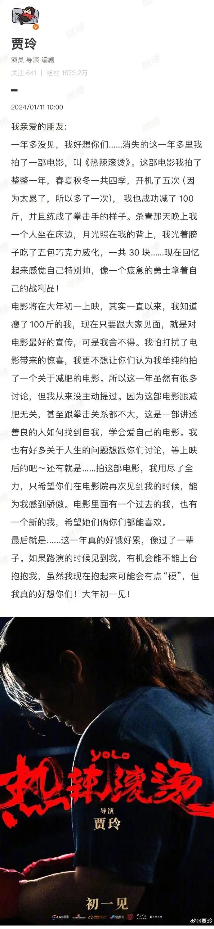 近日,贾玲亲自发文,为大家解开了谜团。她告诉大家,在消失的这段时间里,她拍了一部名为《热辣滚烫》的电影。为了练成影片中拳击手的样子,她成功减重100斤。她感慨到,这一年真的好饿好累,像过了一辈子。自己还透露,杀青那天她一口气吃了30块巧克力威化,像一个疲惫的勇士拿着自己的战利品……