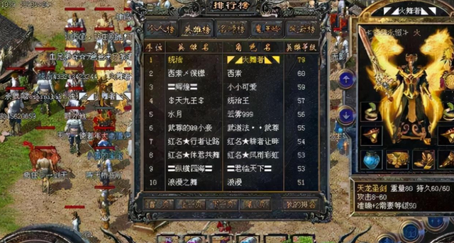 真正让他封神的,是轰动全服的 “天龙活动”!当年官方推出的天龙剑甲,堪称传奇顶级神兵,对应的争夺活动吸引了全服土豪和高玩,不管是砸钱的大佬还是肝怪的散人,都盯着这份终极奖励。火舞者作为 84 区的代表,凭借前期积累的实力和必胜的决心,一路过关斩将,排名稳居前列,成为玩家们最看好的 “夺冠热门”,所有人都以为天龙剑甲会被他稳稳拿下。