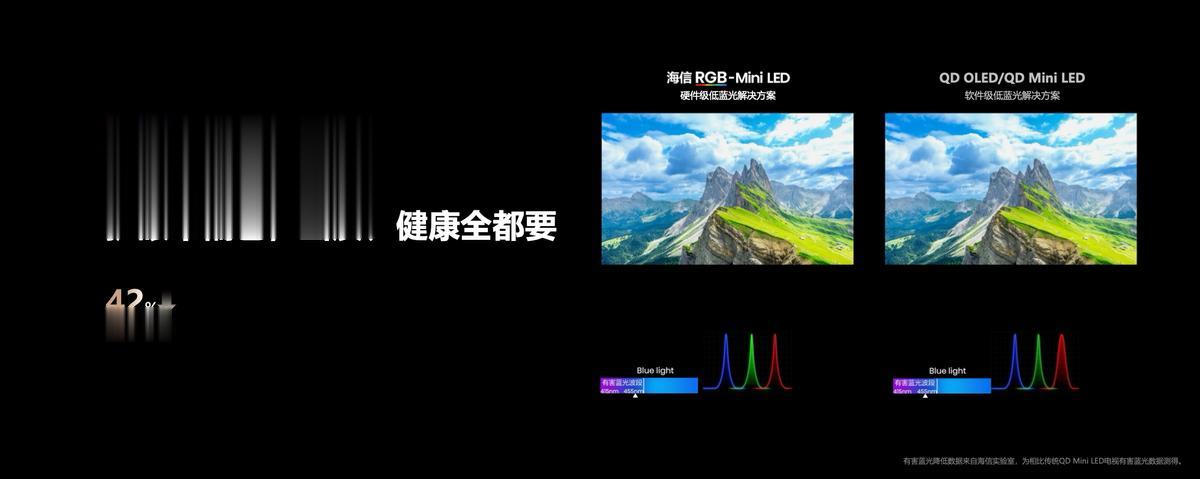 这台E8S用的是海信RGB-Mini LED技术,这可是现在全球公认的全新一代显示技术。现在市面上主流的QD-Mini LED,哪怕是升级后的SQD-Mini LED,本质上还是QD-Mini LED的单色背光方案,只是在面板上加厚色阻,虽然一定程度上提升了色域覆盖到BT.2020,但存在高亮色彩冲淡、亮度不持久、光晕难控制、高能耗与不护眼等一系列问题。而海信RGB-Mini LED电视是对光源的底层重构,直接控制 R、G、B 三颗独立芯片发光,因为光源足够纯净,所以色彩表现力直接拉满。