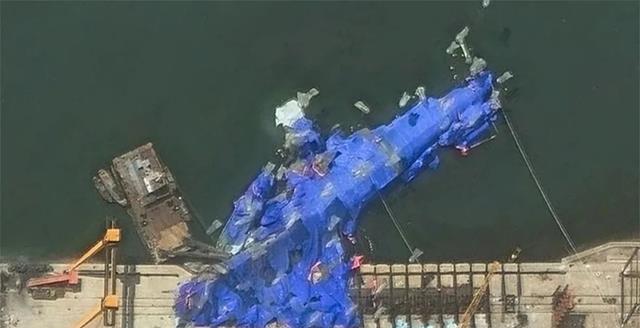 5月21日当天船只发生了事故,5月22日的图像显示船厂迅速为受损军舰盖上了防水布,速度还是比较快。从卫星图像上甚至可以看到,船厂为了让将军观看军舰下水而专门精心搭设的一处观景台。另外舰艇的中部和后部分别有1艘和2艘拖船用于承担一部分舰艇重量,避免进一步损伤。蓝色的防水布不仅覆盖了船体,还覆盖了船体中前部分的船台滑道,还可见岸上有两台大型的起重机正在旁边作业,试图扶正船只。
