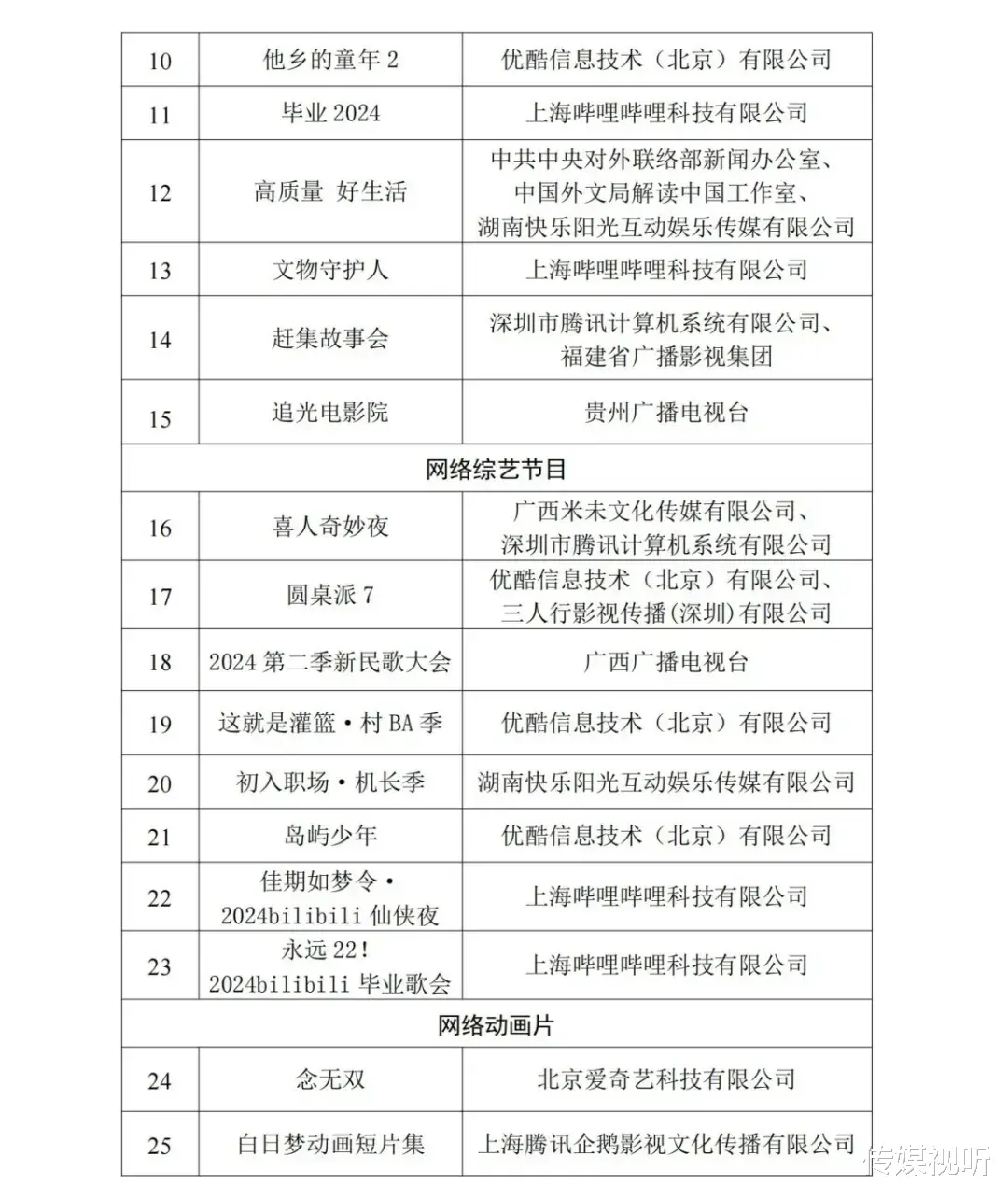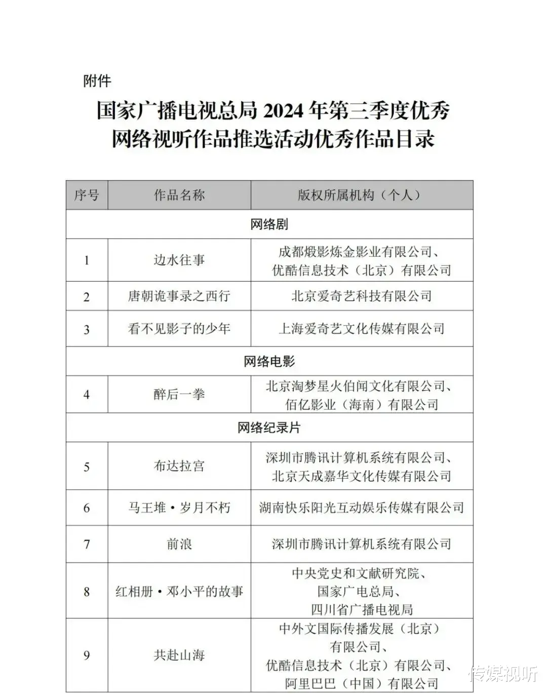 刚刚,国家广播电视总局发布《关于公布2024年第三季度优秀网络视听作品推选活动评审结果的通知》。