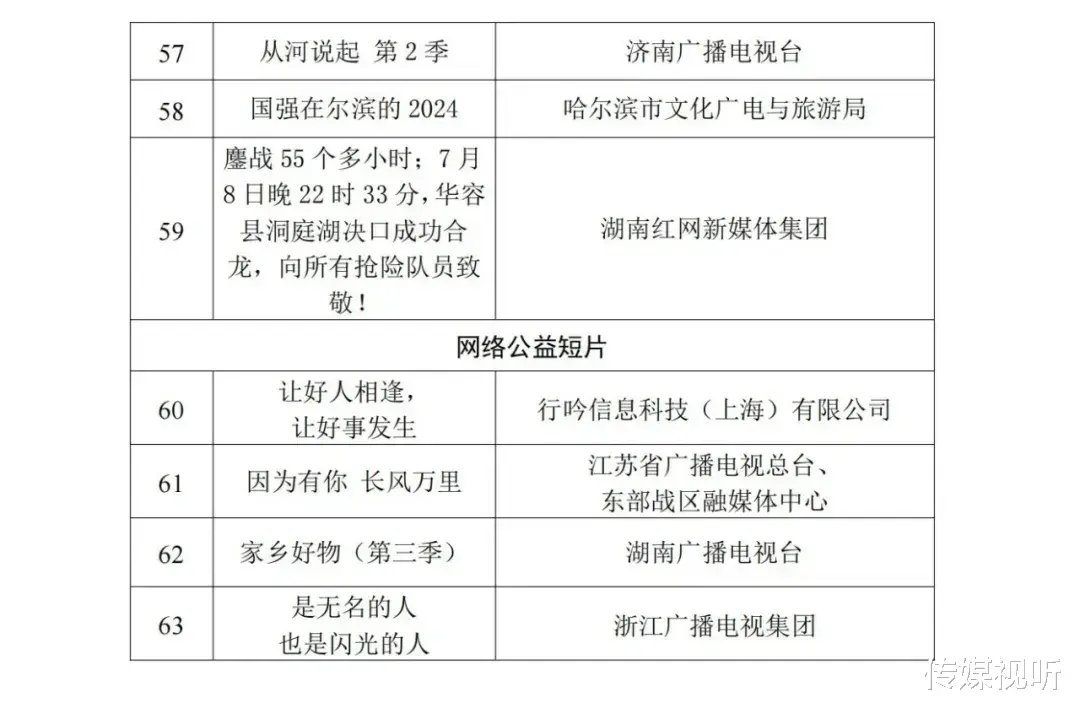 通知指出,为进一步丰富优质网络视听内容供给,发挥精品节目示范引领作用,营造良好创作传播生态,国家广播电视总局近期组织开展了2024年第三季度优秀网络视听作品推选活动。经省级广电行政部门和中央直属单位等推荐,专家评审委员会评审,最终确定63部作品入选,现将结果予以公布。