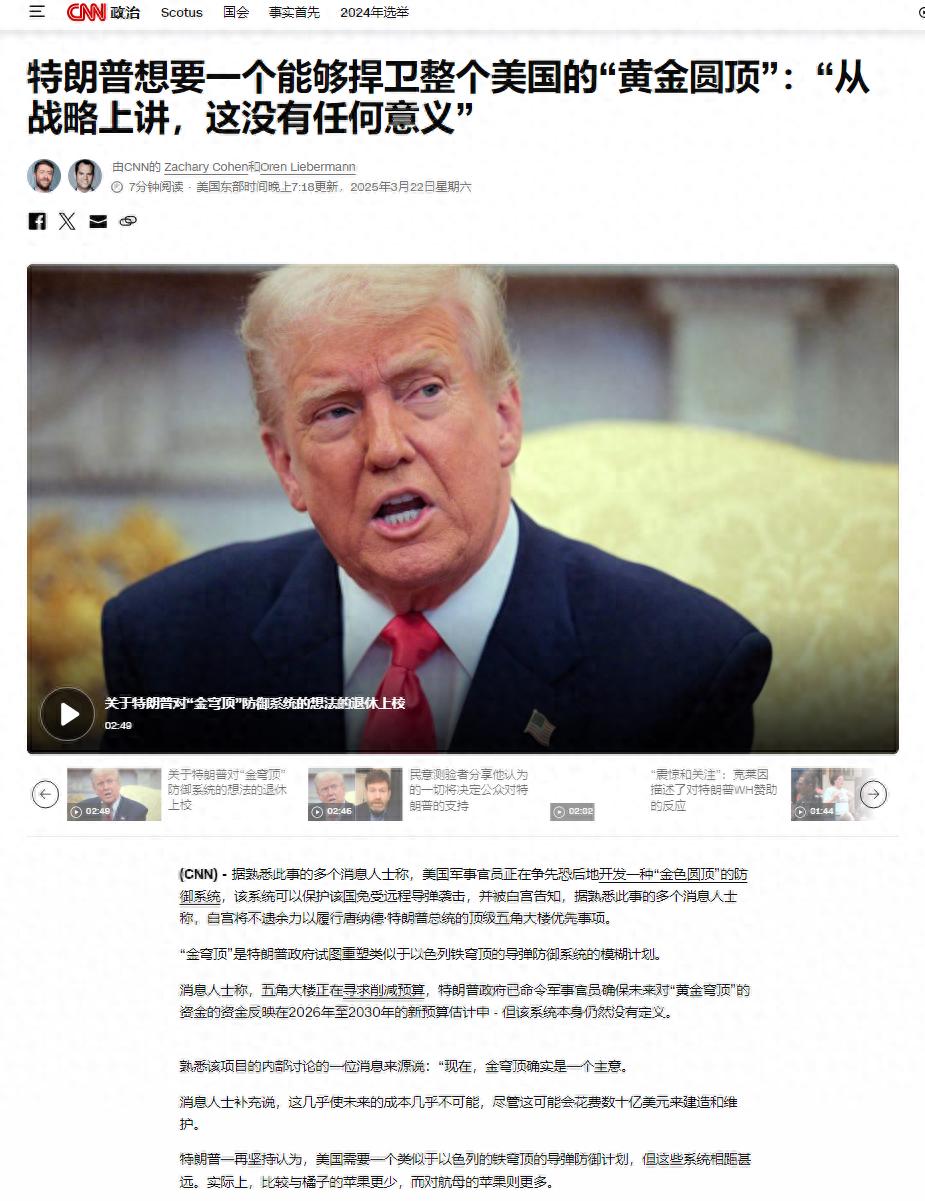 3月22日,CNN报道称特朗普已经致力于开发“金穹”导弹防御系统,据多个消息人士称,白宫已经将特朗普非常重视的“金穹”导弹防御系统开发列为优先事项。特朗普要求该系统能防御弹道导弹和和高超音速导弹。