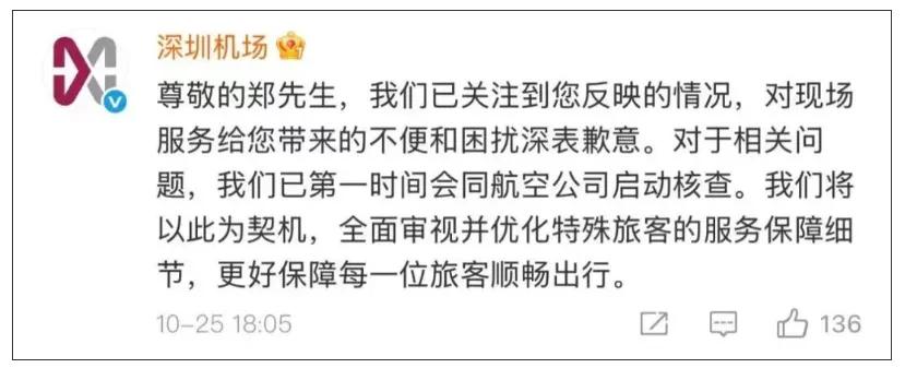 实际上出现的情况是,在郑智化帖子发出后三小时零六分钟,深圳机场就道歉了!