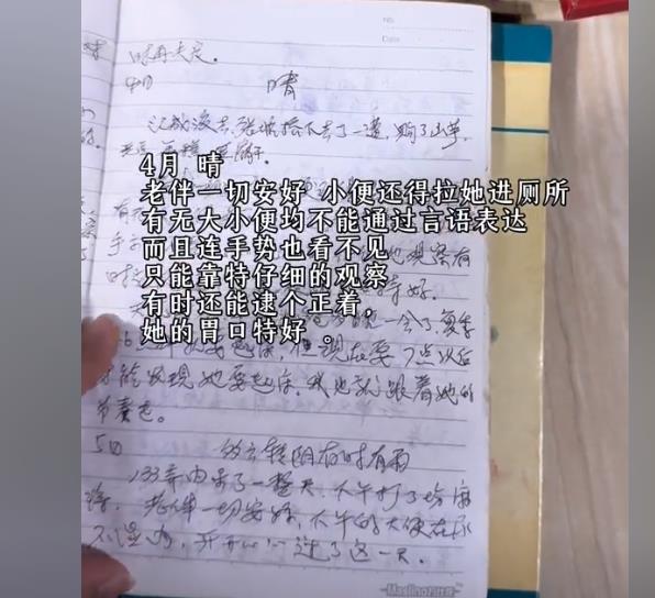 在奶奶生病的十几年里,爷爷写了满满七本日记,日记中不仅记录了当天发生的所有事情,甚至连奶奶上厕所都写的清清楚楚。