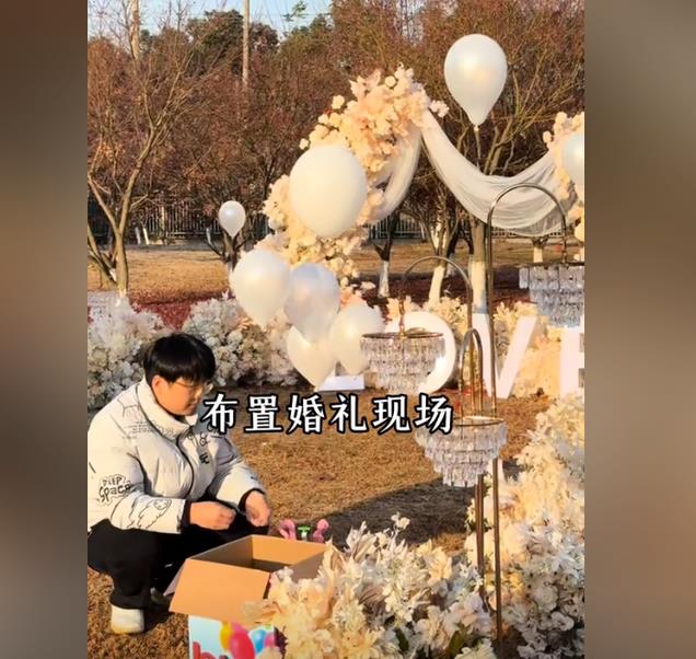 大家一起在养老院布置婚礼现场,还是一个露天的草坪婚礼,不仅有鲜花还有气球,甚至高朋满座。