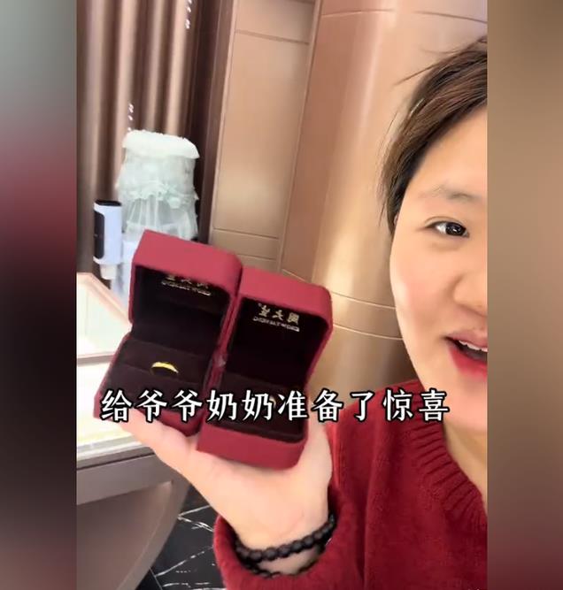 既然是举办婚礼,那怎么能没有戒指,博主也为爷爷准备了一个惊喜,她专门去买了两枚金戒指,毕竟这可是爷爷奶奶的金婚,怎么能少的了金戒指。
