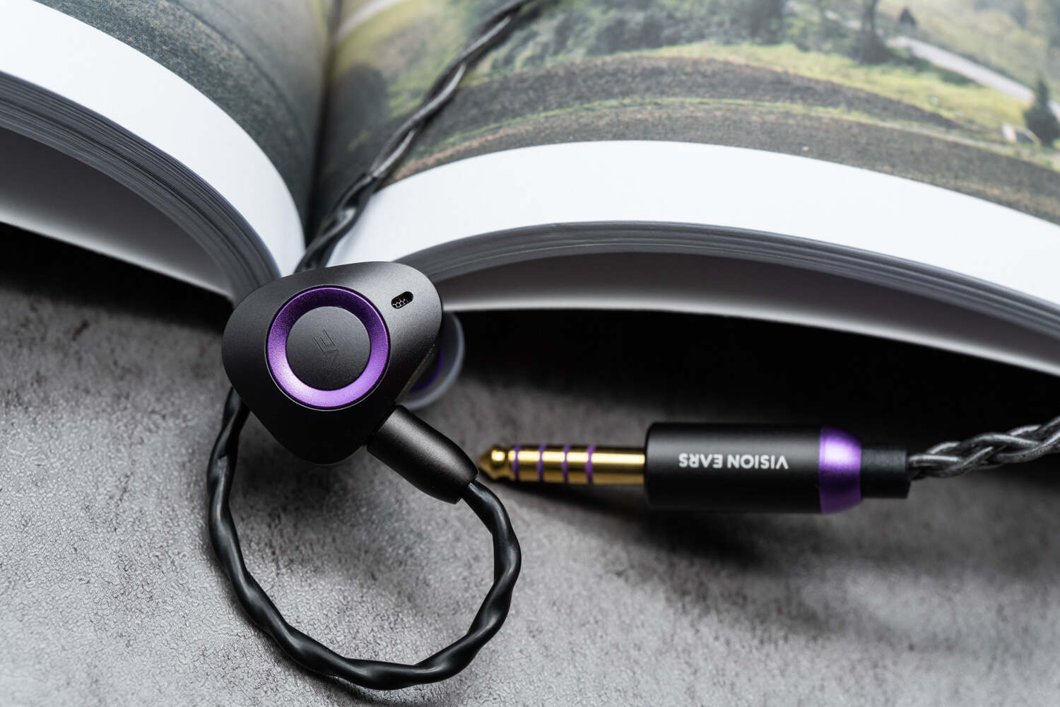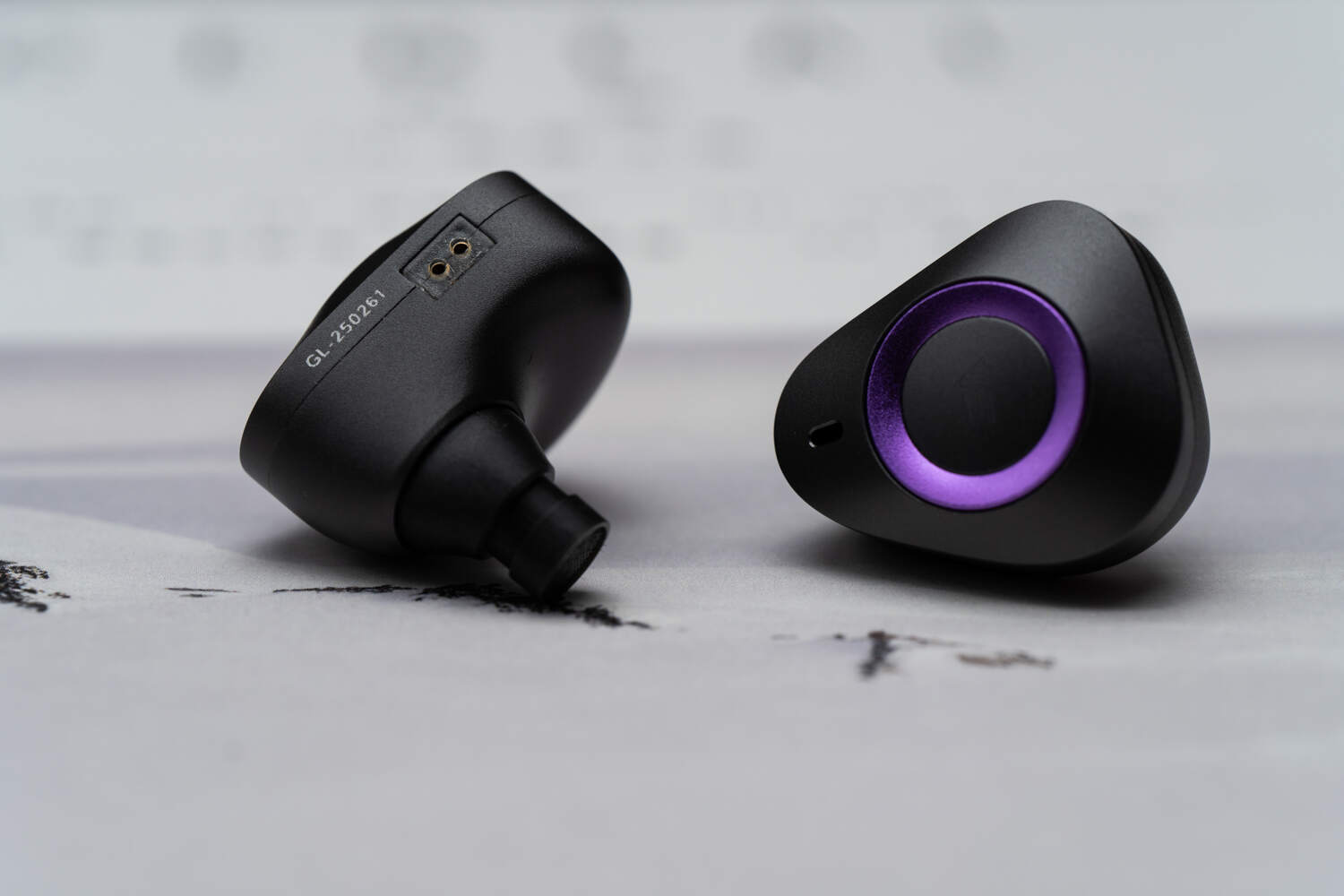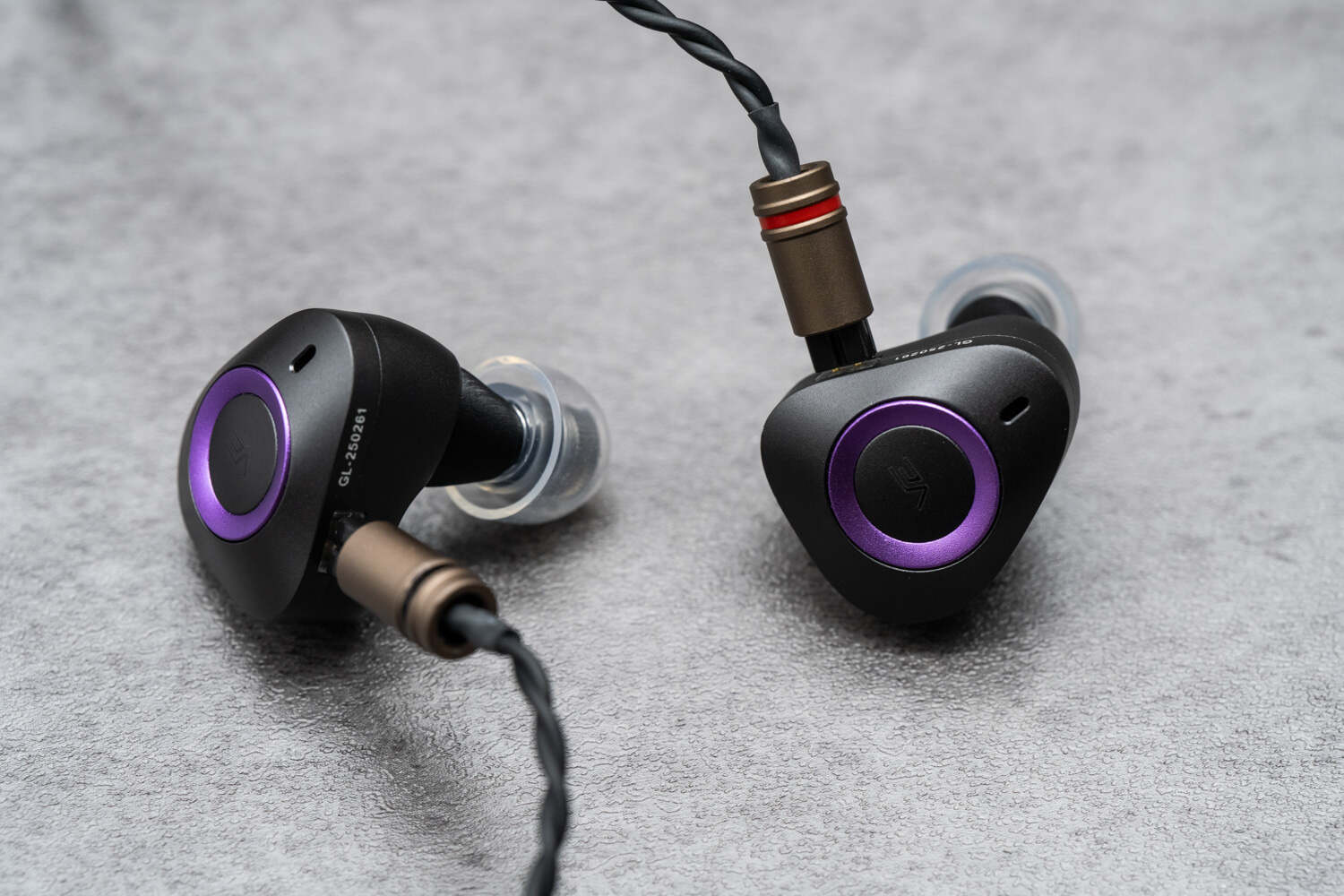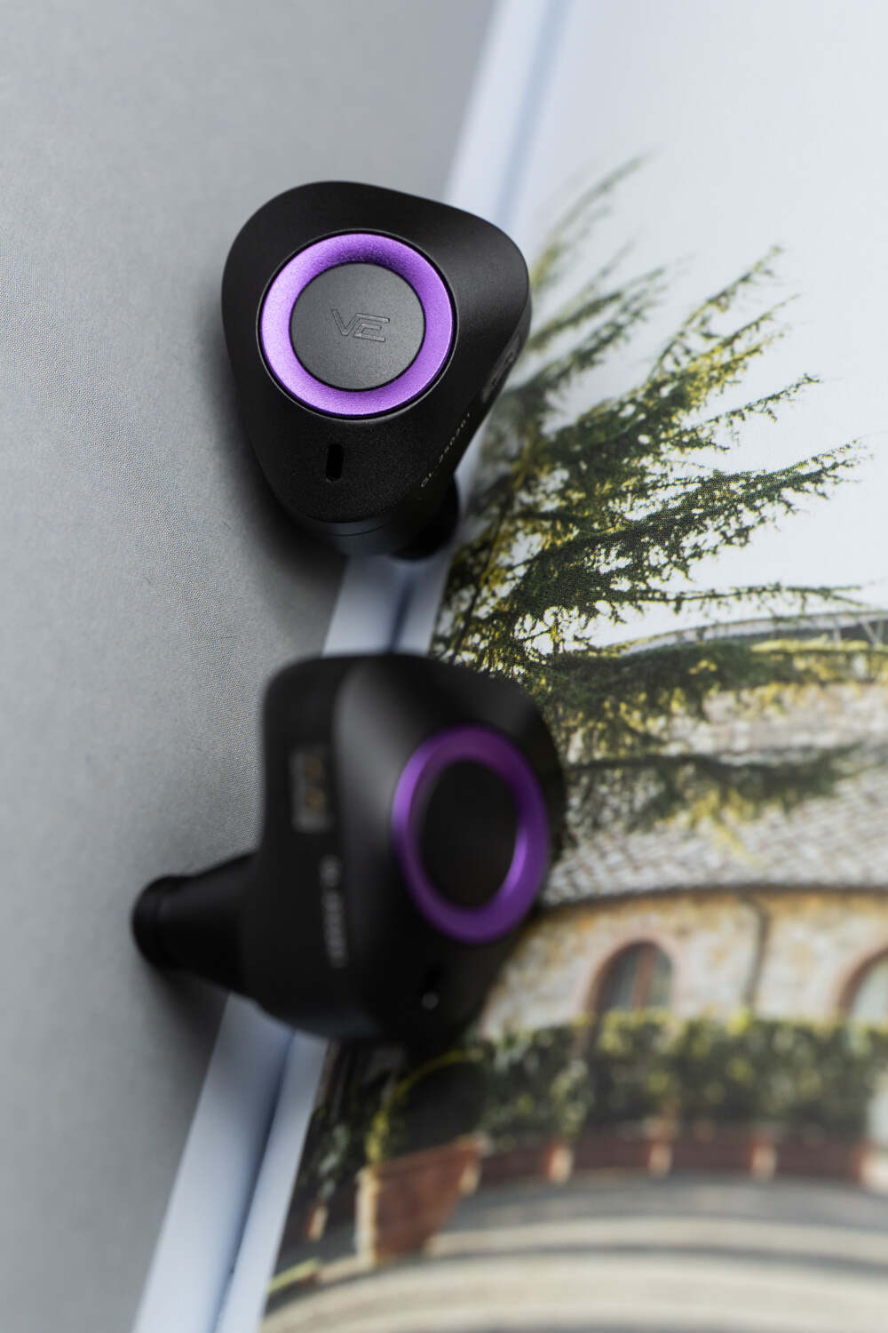 Go live!的包装是稳重而明快的白底封套,包装盒与内层的盒体由黑、白、紫三色构成,与单元腔体上的紫色装饰圈相呼应,并且这个紫色的饱和度和色深很是漂亮,鲜艳而不扎眼。Go live!的配件包括一个圆形拉链收纳包、一对分开的腔体保护袋、一块擦拭布和一整套紫色导管的SpinFit耳套,整体形态和色调都与黑+紫色的耳机腔体、线材非常搭调。Go live!的腔体外壳为黑色金属材质,面板上的紫色圆形装饰圈是其外观设计的最大亮点,和当年iPhone的指纹Home键极为神似,看到都忍不住用手指去按一下。面板边缘较为锐利而腔体背面的线条较为柔和。通常来说我个人使用SpinFit耳套总会觉得导管过长贴合度不佳,但Go live!搭配这款耳套完全没这个问题,贴合且舒适,想来是VE在佩戴设计方面下了功夫,人体工学做得很棒。Go live!的线材是黑色线身,插头和分线器主体黑色,上面同样有精细的紫色点缀。