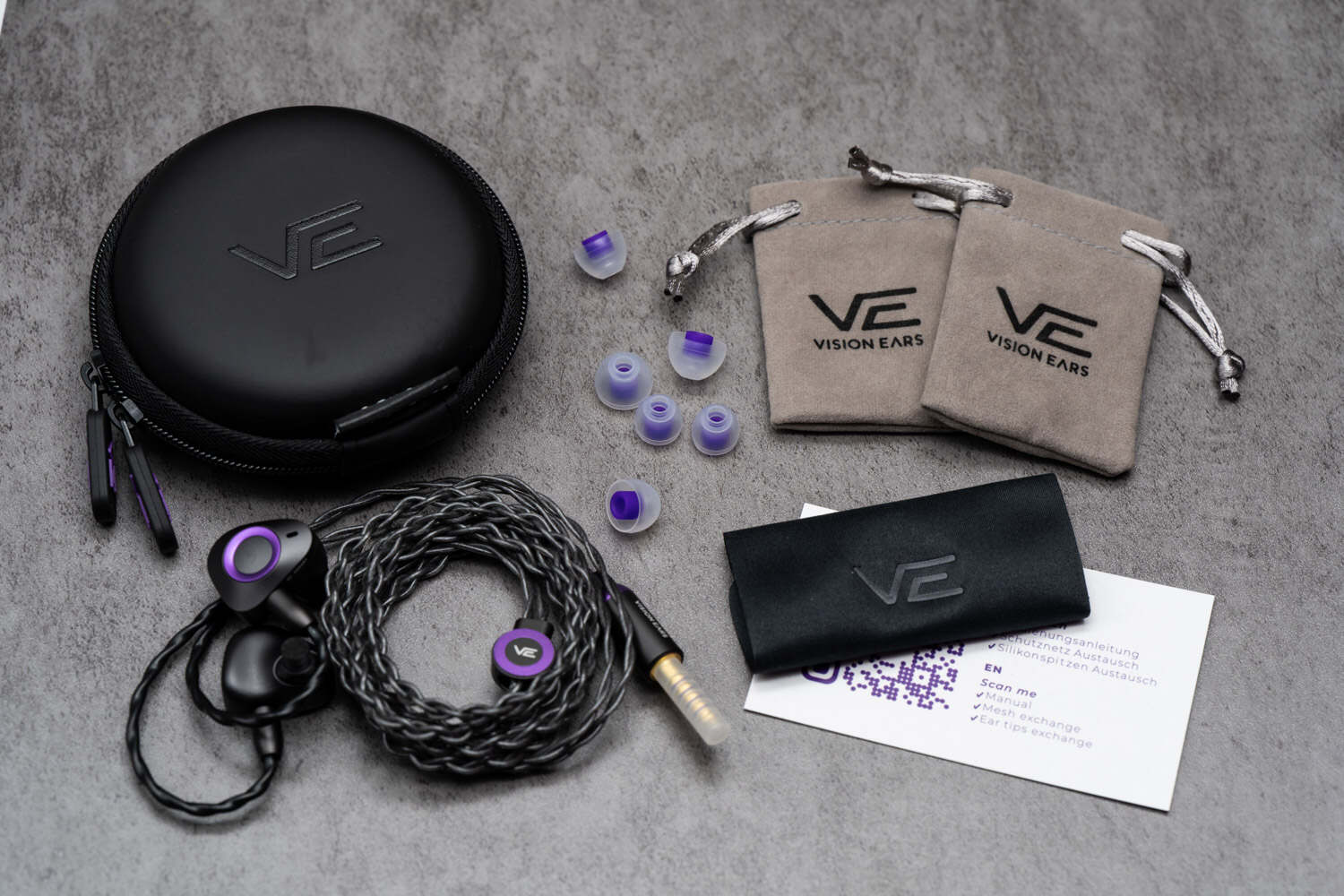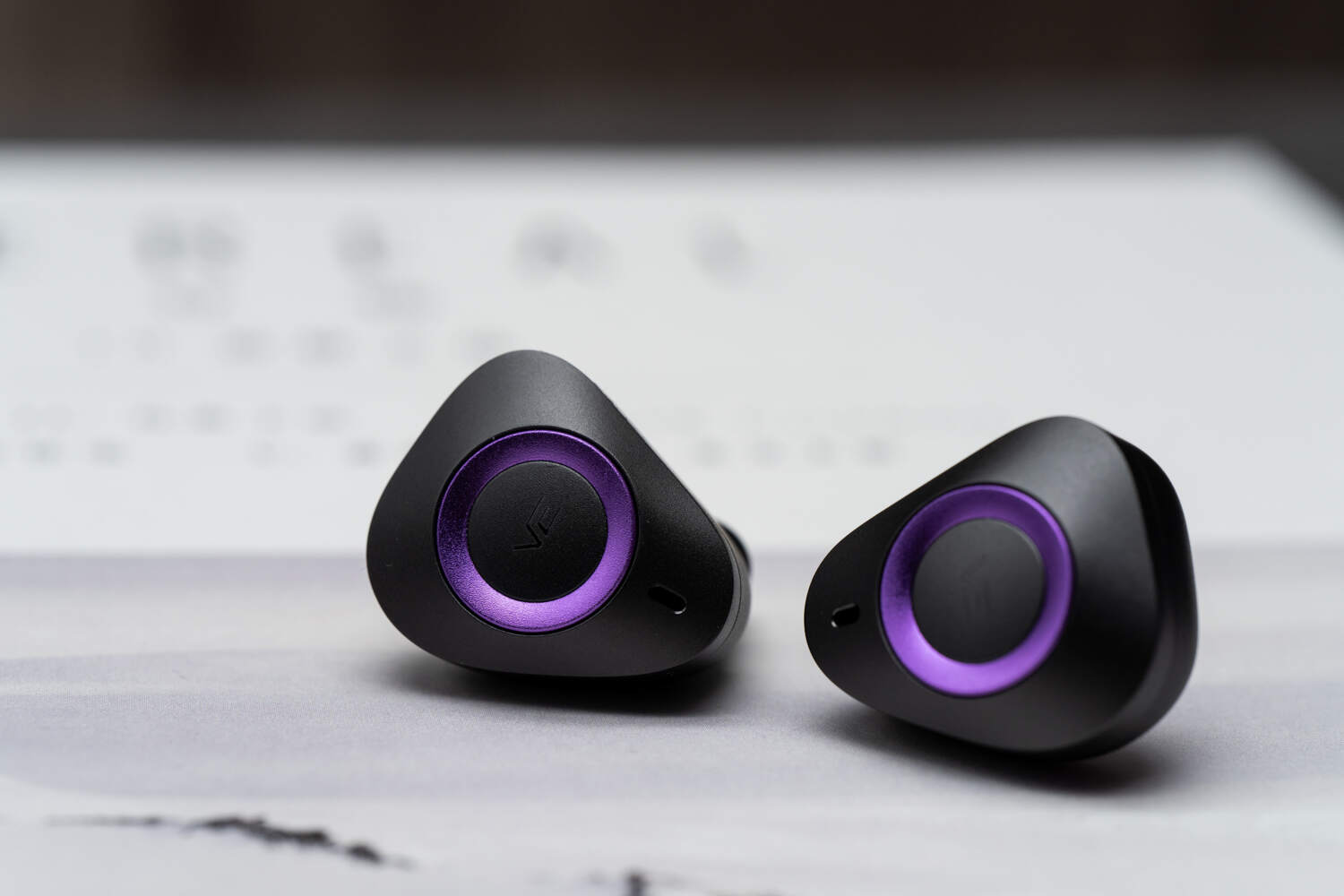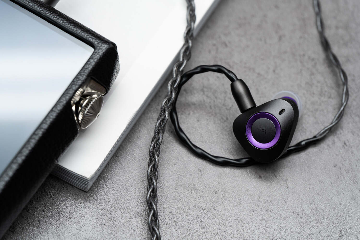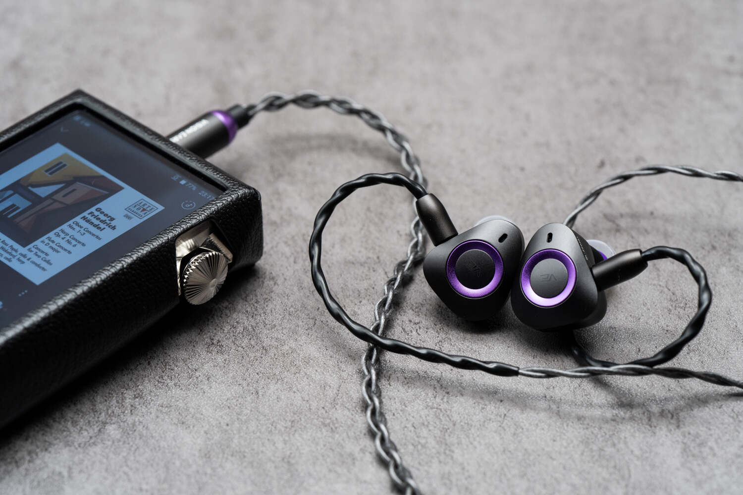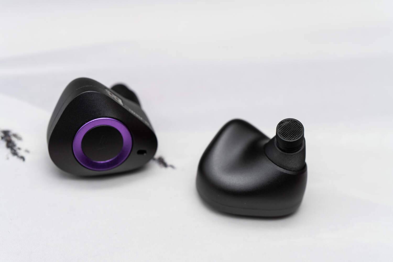 Go live!的包装是稳重而明快的白底封套,包装盒与内层的盒体由黑、白、紫三色构成,与单元腔体上的紫色装饰圈相呼应,并且这个紫色的饱和度和色深很是漂亮,鲜艳而不扎眼。Go live!的配件包括一个圆形拉链收纳包、一对分开的腔体保护袋、一块擦拭布和一整套紫色导管的SpinFit耳套,整体形态和色调都与黑+紫色的耳机腔体、线材非常搭调。Go live!的腔体外壳为黑色金属材质,面板上的紫色圆形装饰圈是其外观设计的最大亮点,和当年iPhone的指纹Home键极为神似,看到都忍不住用手指去按一下。面板边缘较为锐利而腔体背面的线条较为柔和。通常来说我个人使用SpinFit耳套总会觉得导管过长贴合度不佳,但Go live!搭配这款耳套完全没这个问题,贴合且舒适,想来是VE在佩戴设计方面下了功夫,人体工学做得很棒。Go live!的线材是黑色线身,插头和分线器主体黑色,上面同样有精细的紫色点缀。