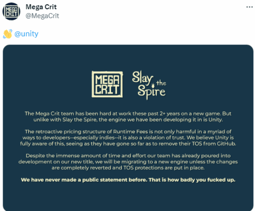当时很多开发者都炸了,发公开信的发公开信,骂街的骂街。《杀戮尖塔》的工作室Mega Crit也发了一封,措辞挺硬的,直接怼Unity这个政策不讲道理。