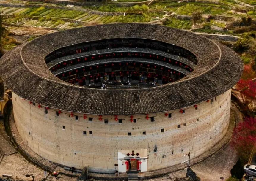 福建多山,地形复杂,在当时的社会环境下,客家人面临着来自自然界和其他族群的威胁。为了防御外敌、抵御自然灾害,同时也为了聚族而居,增强家族的凝聚力,他们充分利用当地的材料和地形,建造出了高大、坚固且功能齐全的土楼。土楼的建筑材料主要是生土、木材、鹅卵石等,这些材料就地取材,成本低廉。生土经过特殊处理后,具有良好的坚固性和保温隔热性能,能够适应南方多变的气候。