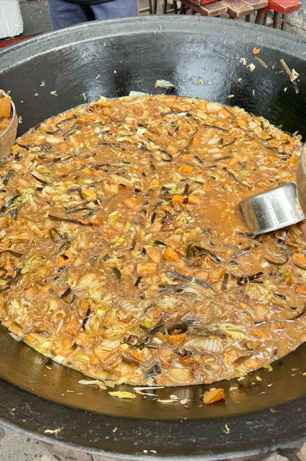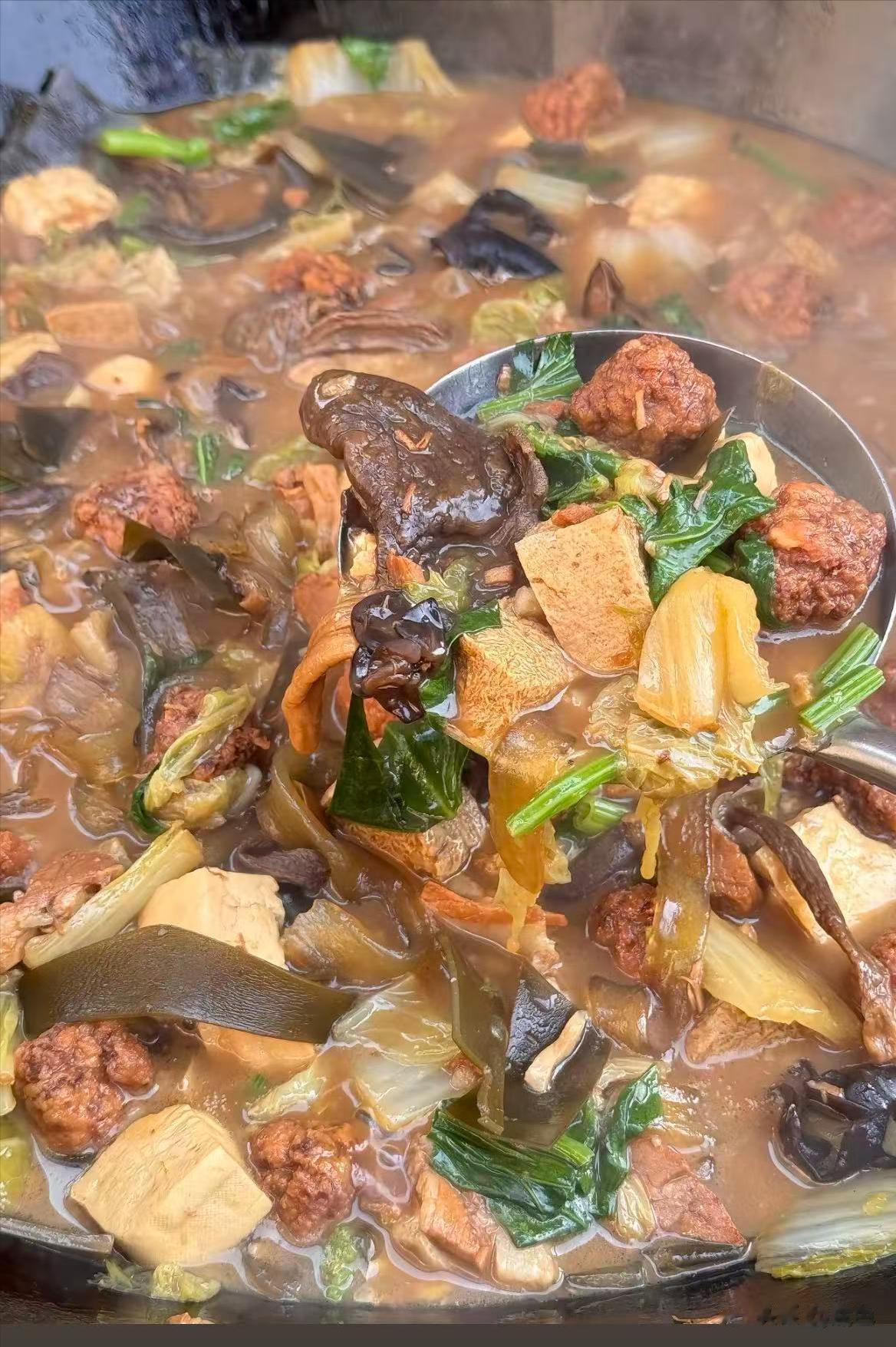 碍于情面我们几个只得遵照老者的话去盛菜,走近了发现里面似乎是什么都有类似于乱炖一样的东西,能看到的食材就有大块的肉片(是很大的那种)、白菜、粉条、丸子、蘑菇、豆腐等等,走近一闻还挺香的,所以我们就尝试着先少盛点尝尝,毕竟不吃也显得不好,假如不好吃就不吃了。