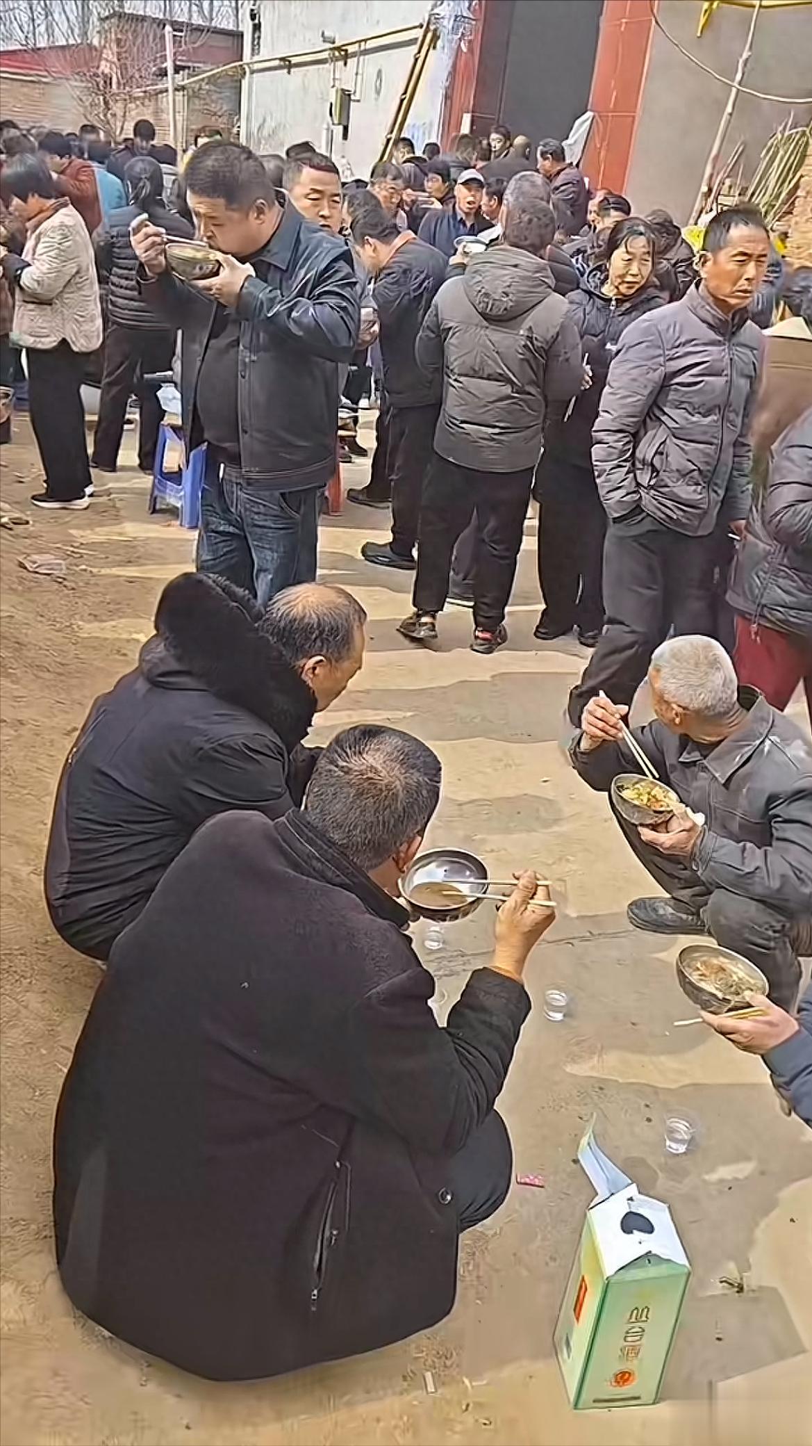 年后在河北参加了一次农村葬礼,进村我就傻眼了,好家伙全村不管男女老少都蹲在事主家的院子和门口一人端着一碗肉菜另外手里还攥着个啃了一半的白面馍馍,甚至街道里面也全是蹲着吃肉菜的人,有些男人的身前还放着一瓶啤酒。
