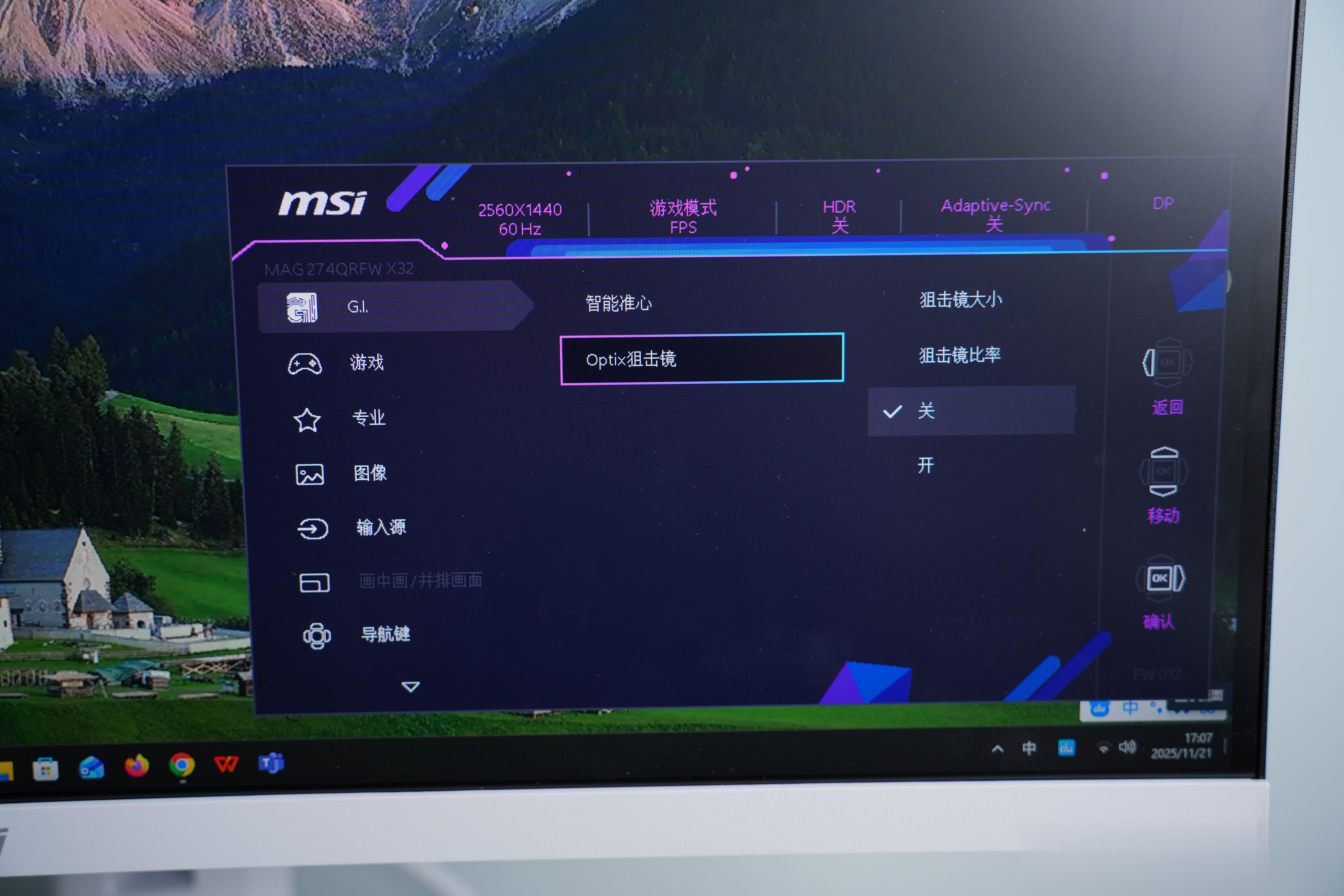 微星MAG 274QRFW X32显示的细节做的也很到位,左下角的OSD摇杆设计成红色,非常醒目还很好看。可以进行很多功能的设置和切换。