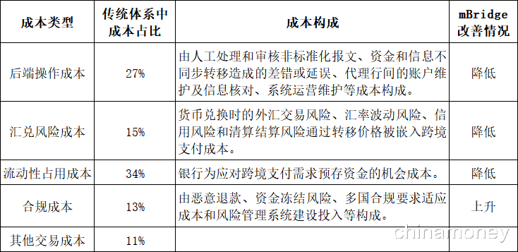 1.后端操作成本。后端操作成本主要由人工处理和审核非标准化报文、资金和信息不同步转移造成的差错或延误、代理行间的账户维护及信息核对、系统运营维护等成本构成。代理行模式下,一笔跨境支付每经过一家中间行即会叠加一次后端操作成本,支付链路越长后端操作成本越高。mBridge走廊网络的分布式账本技术实现资金和信息的同步转移,共识机制确保各节点交易的同步正确记录,可大幅精简解决传统代理行模式下信息不对称问题的成本环节。