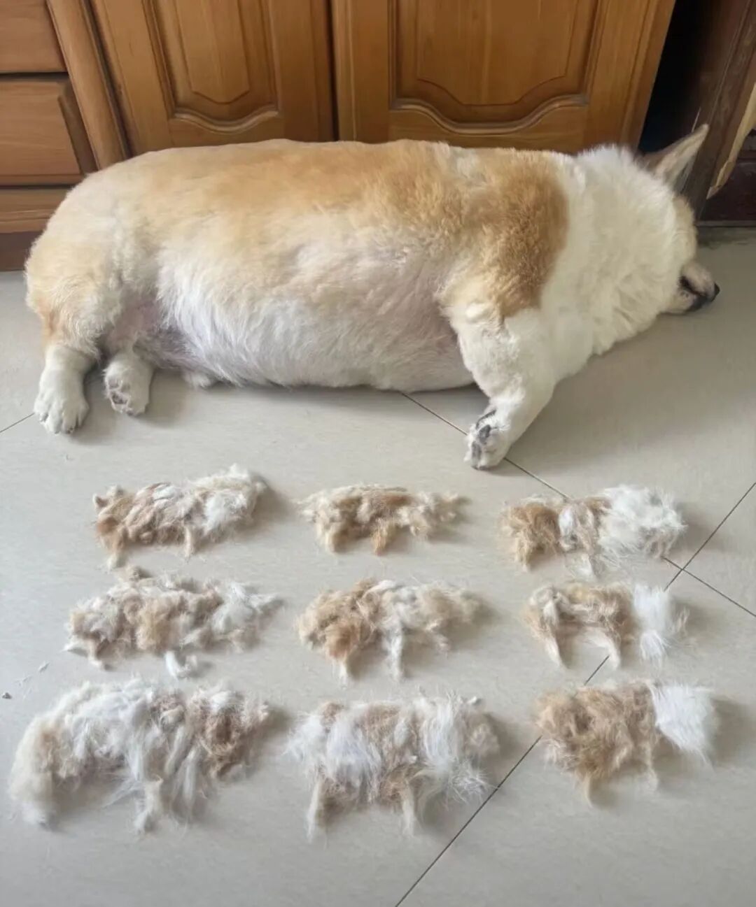 10.给柯基梳毛,主人把掉毛摆成小狗的样子,真是太像了,果然有趣的灵魂万里挑一啊。