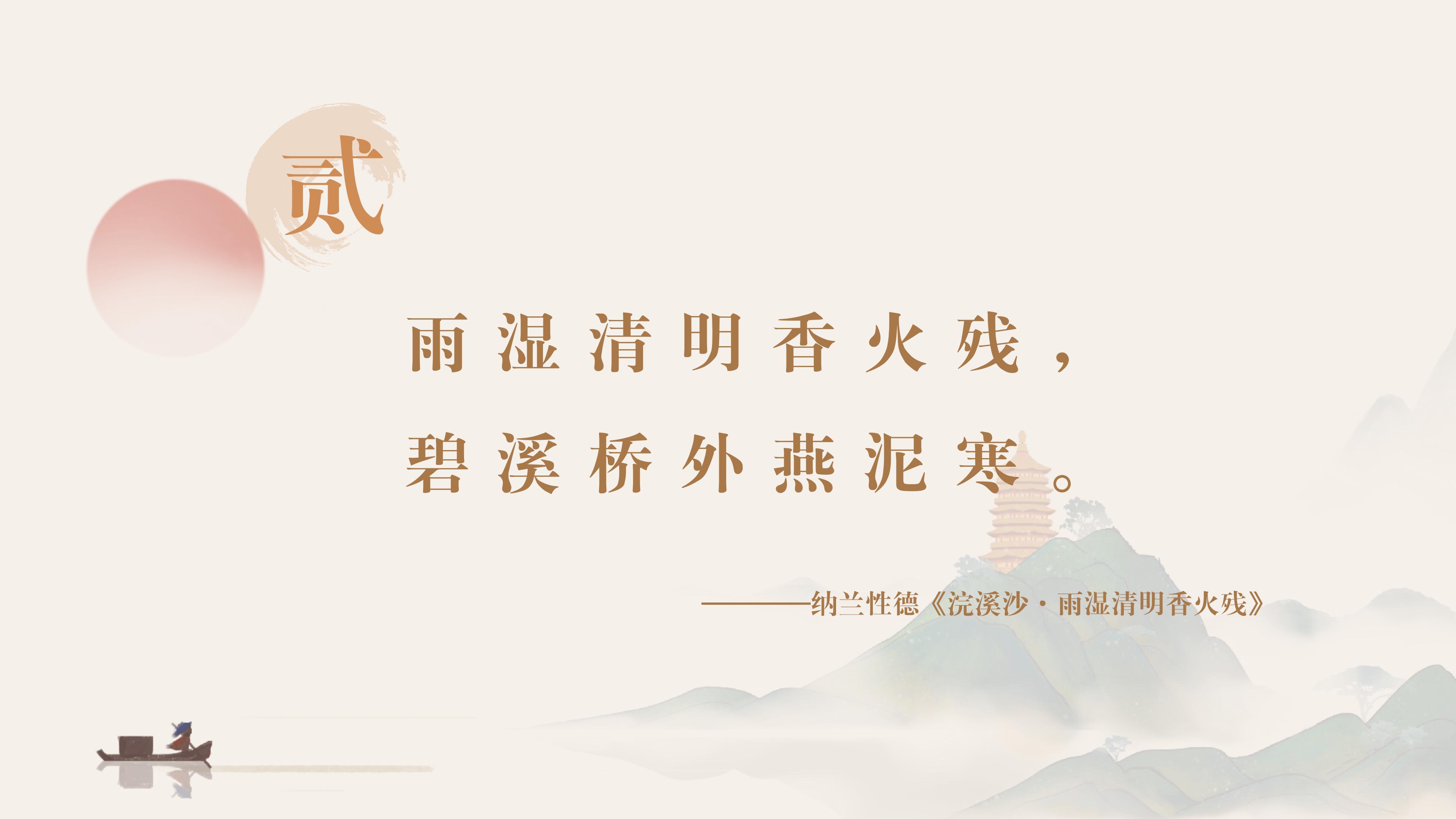 二、纳兰性德的《浣溪沙·雨湿清明香火残》:“雨湿清明香火残,碧溪桥外燕泥寒。”描绘了一种悲凉的心境,表现出对往昔生活的留恋和忧伤。
